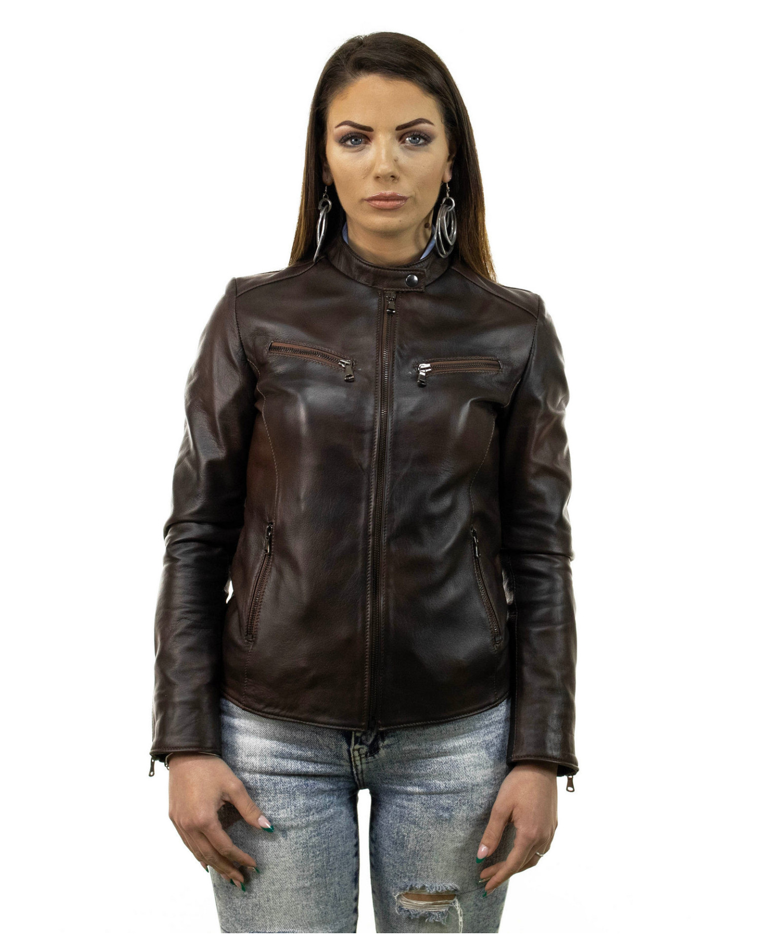 Women's leather jacket with mandarin collar.