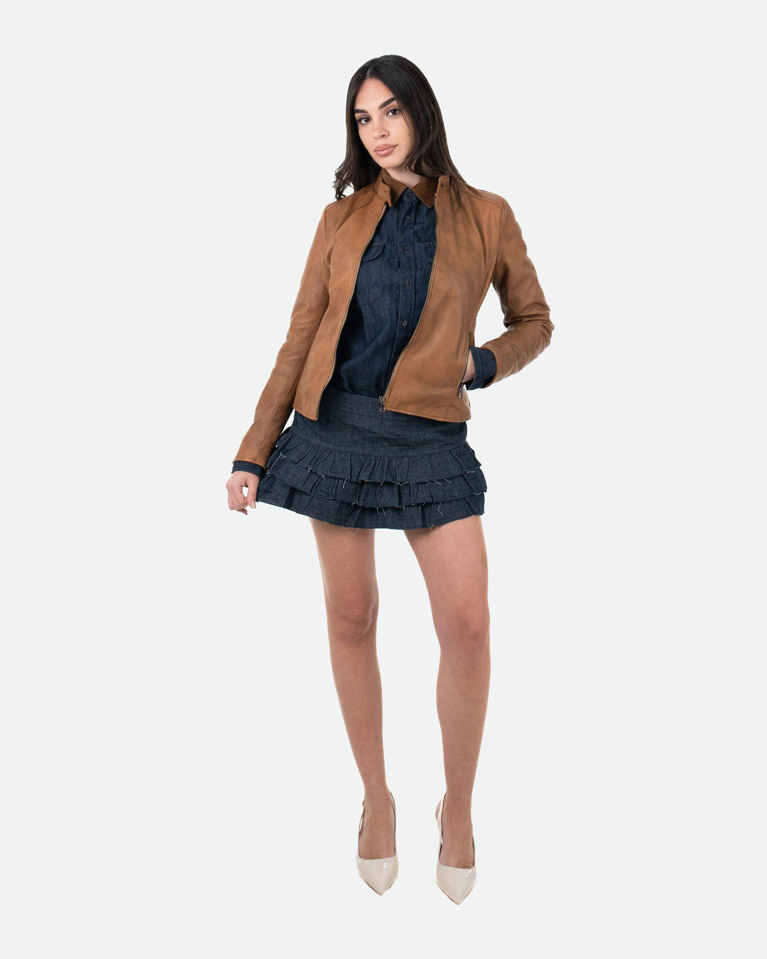 The Violetta Bis women's leather jacket is the perfect piece for those who want to stand out with elegance. The deep brown hue meets the softness of genuine leather, creating a refined balance between femininity and contemporary character.