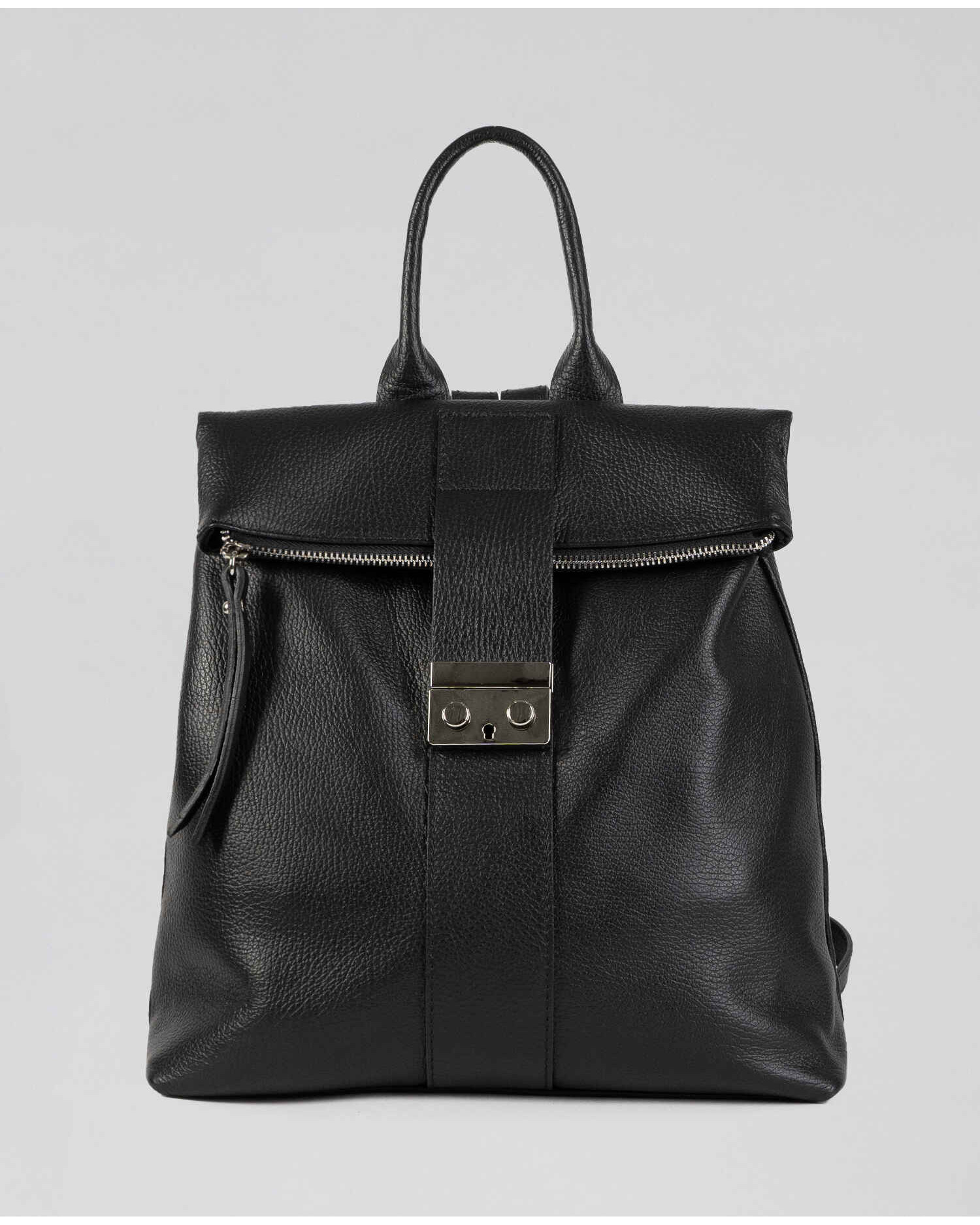 Backpack in genuine black leather with zip closures and inner lining.