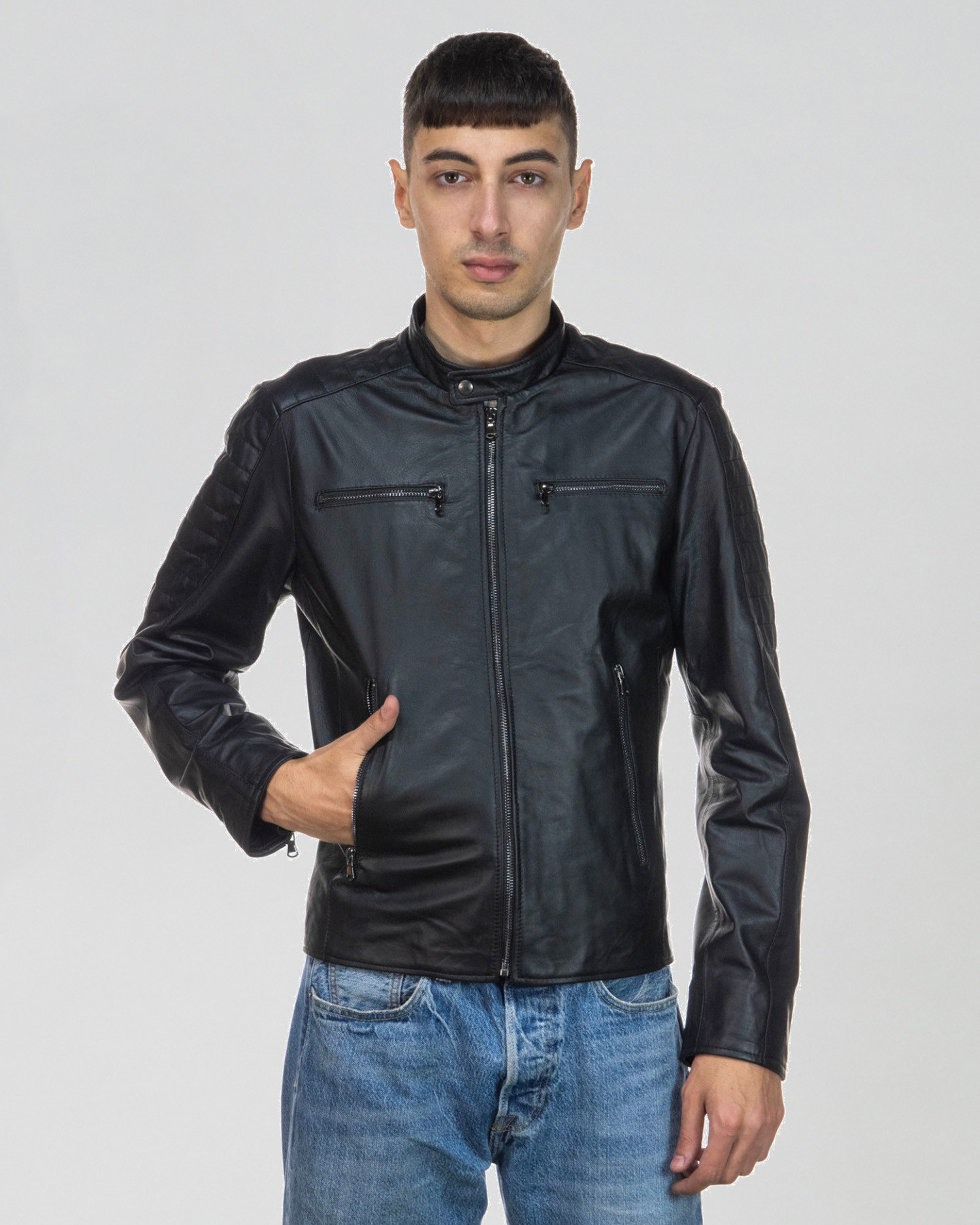 The U05 men's leather biker is a bold statement piece designed for those who want to combine contemporary style with everyday functionality. The slim fit enhances the silhouette, while the zippers on the sleeves and quilted shoulders add a technical and distinctive touch, making the biker durable and dynamic.