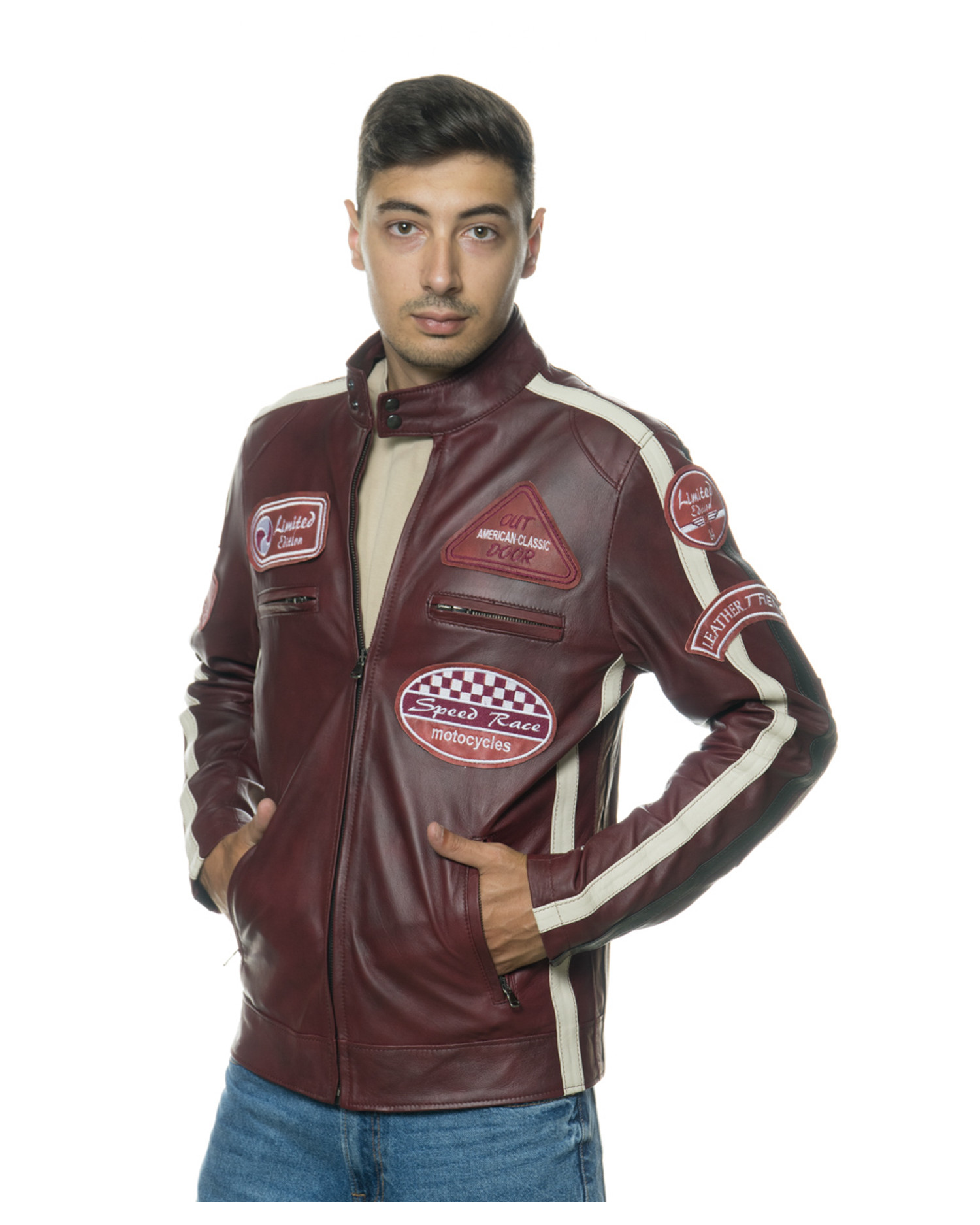Man's leather jacket mod. biker in genuine Bordeaux  leather 100% made in Italy