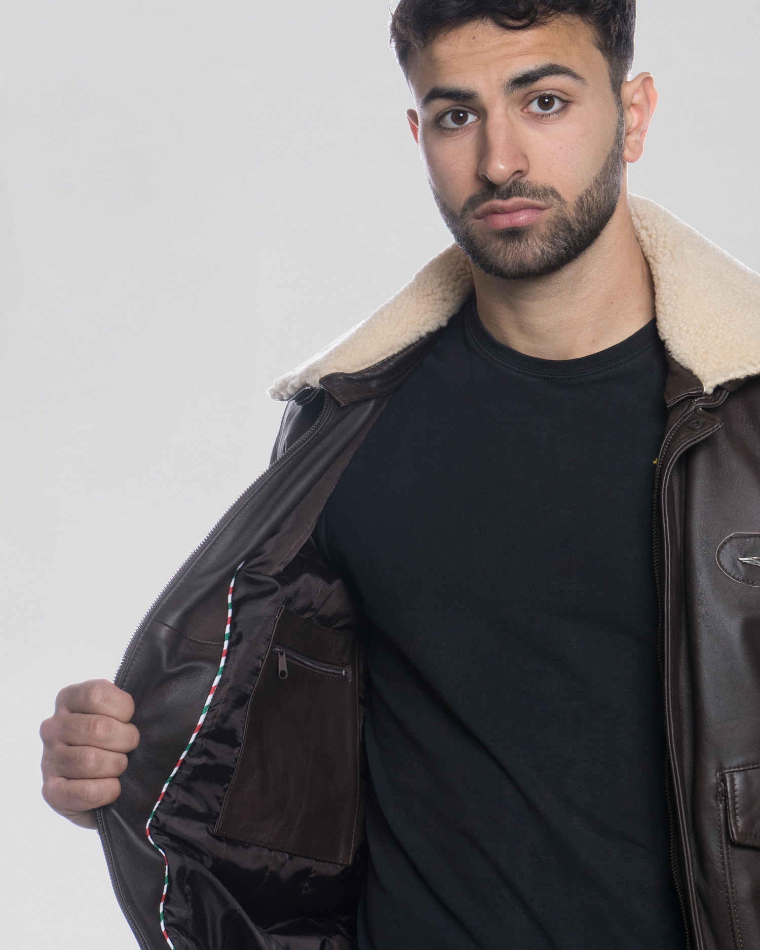 Aviator-style leather bomber jacket with shearling collar and decorative patches.