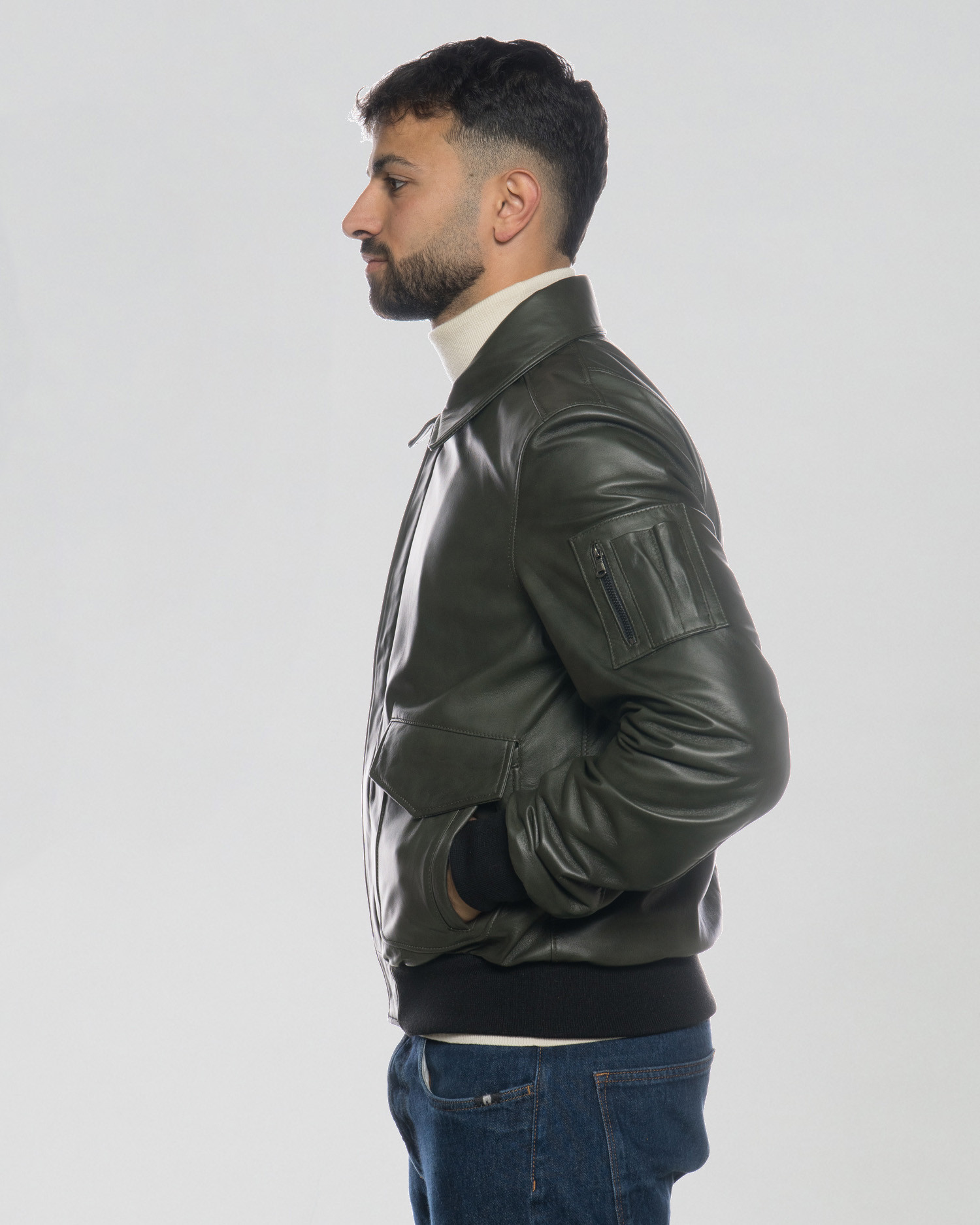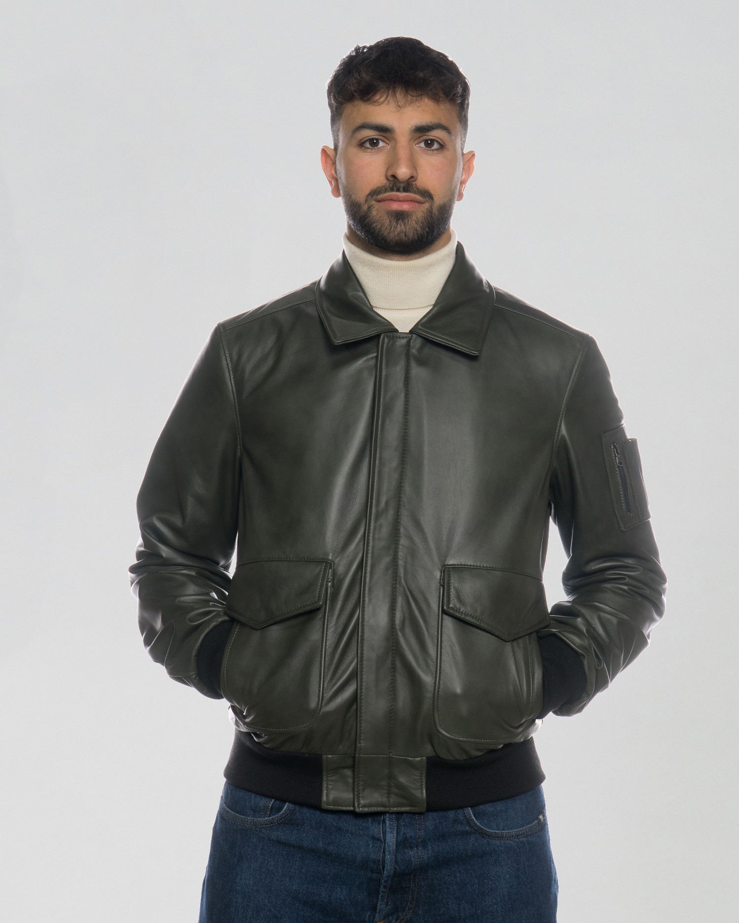 Genuine green leather bomber jacket with ribbed details and shirt collar.