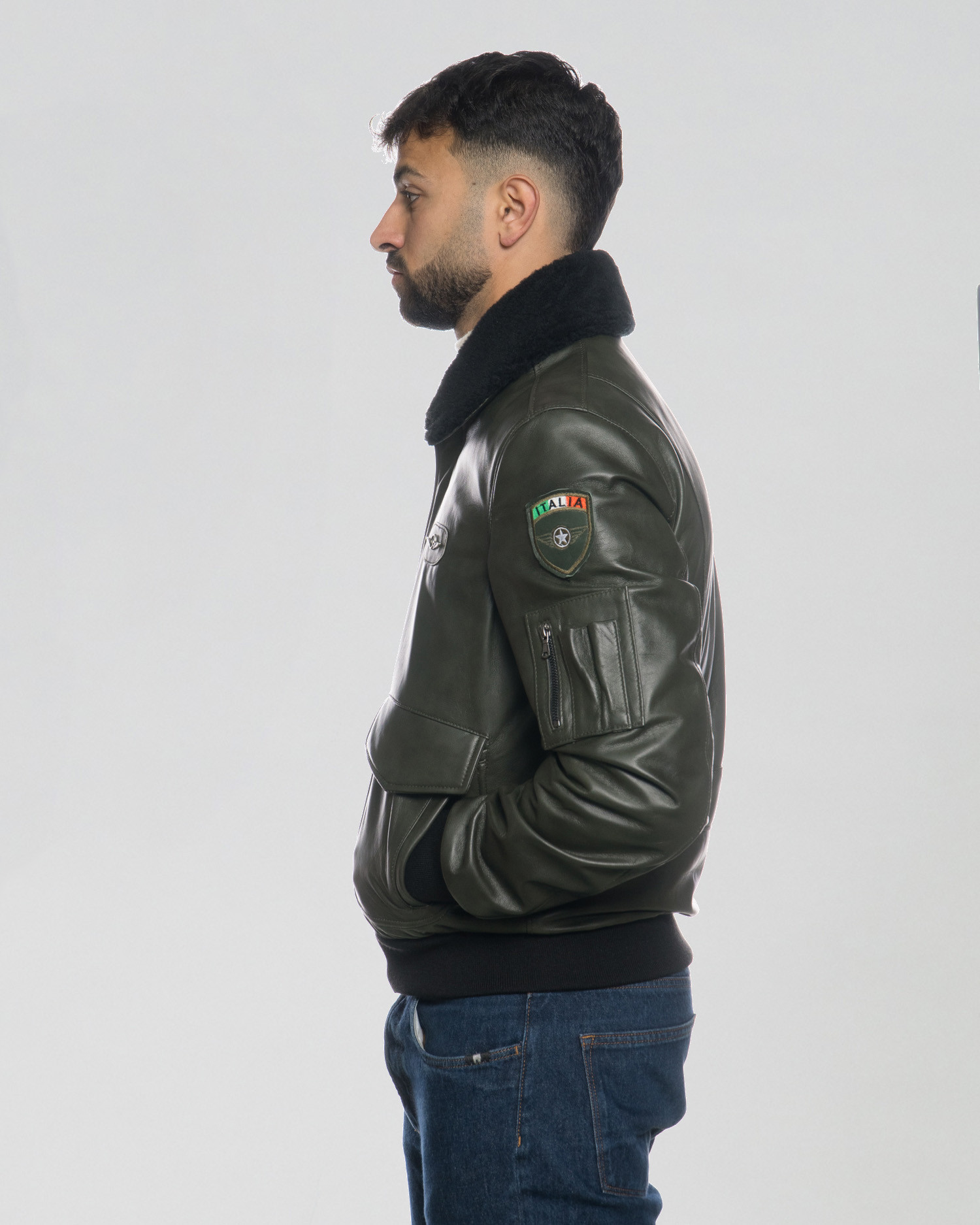 The genuine leather offers softness, durability, and a natural fit, while the elasticated cuffs and hem ensure comfort and a snug feel, and the shearling collar provides warmth and style. The front flap pockets add everyday practicality without compromising the refined design, enhanced by decorative patches that echo the heritage of pilot bomber jackets.