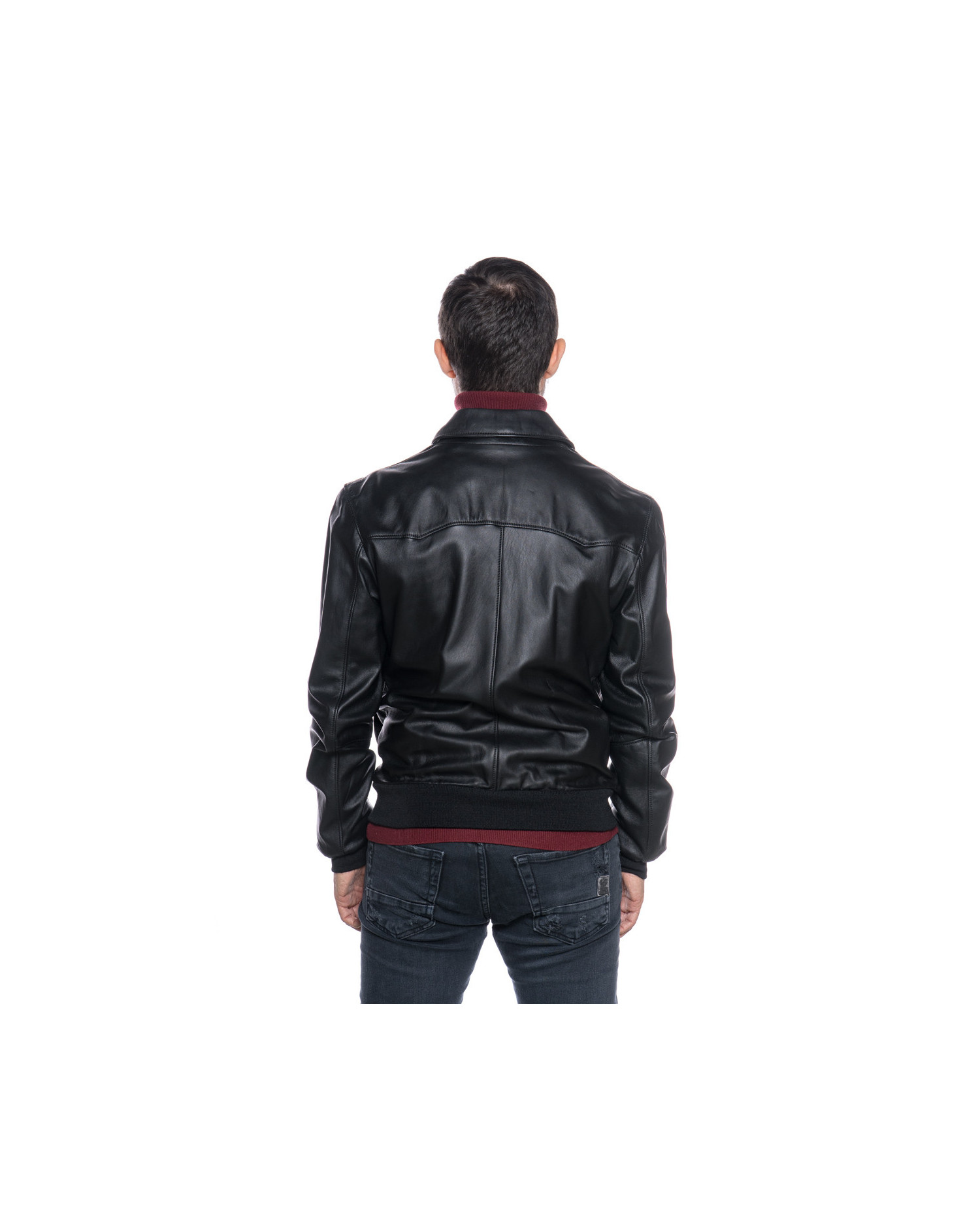 Leather bomber jacket with a shirt collar and stretch fabric on the cuffs and hem.