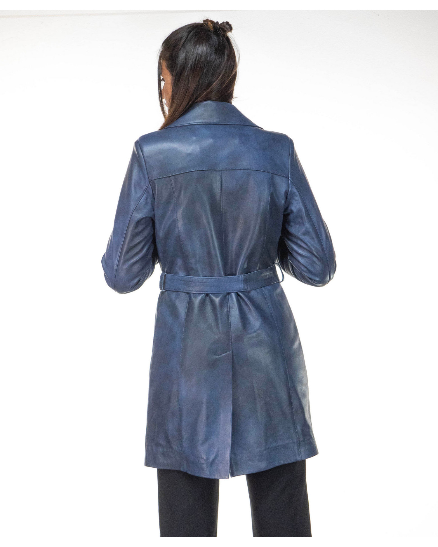 Women's leather coat with belt.