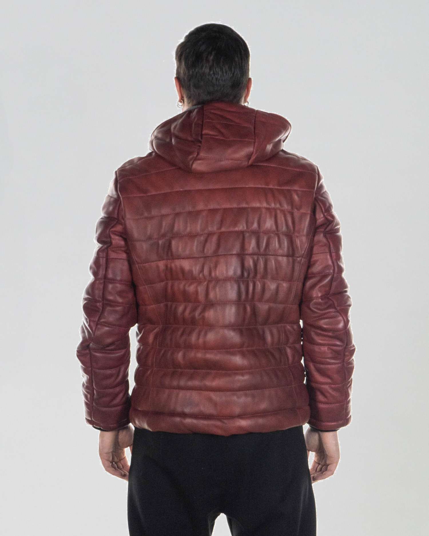 Leather down jacket with thermal padding and hood.