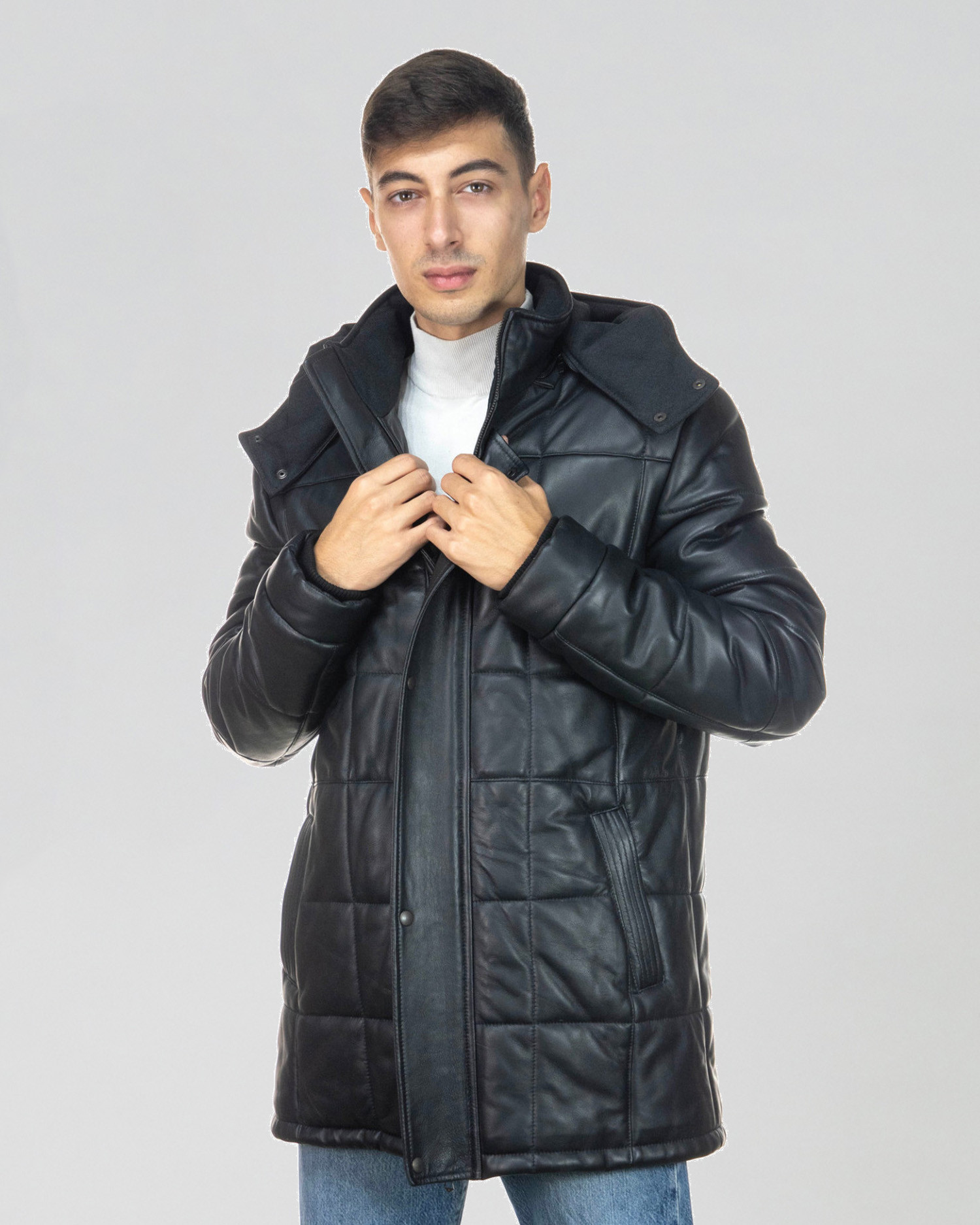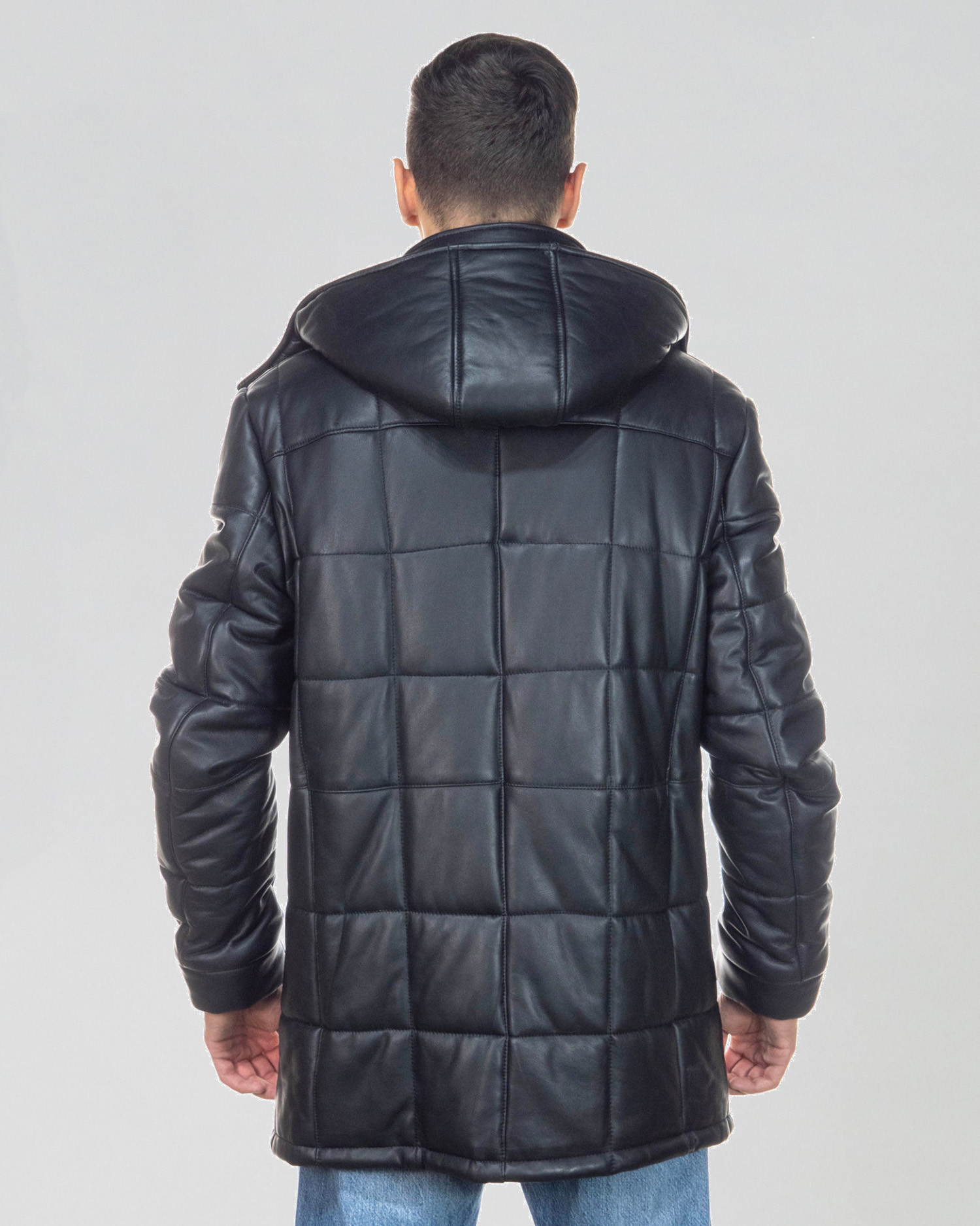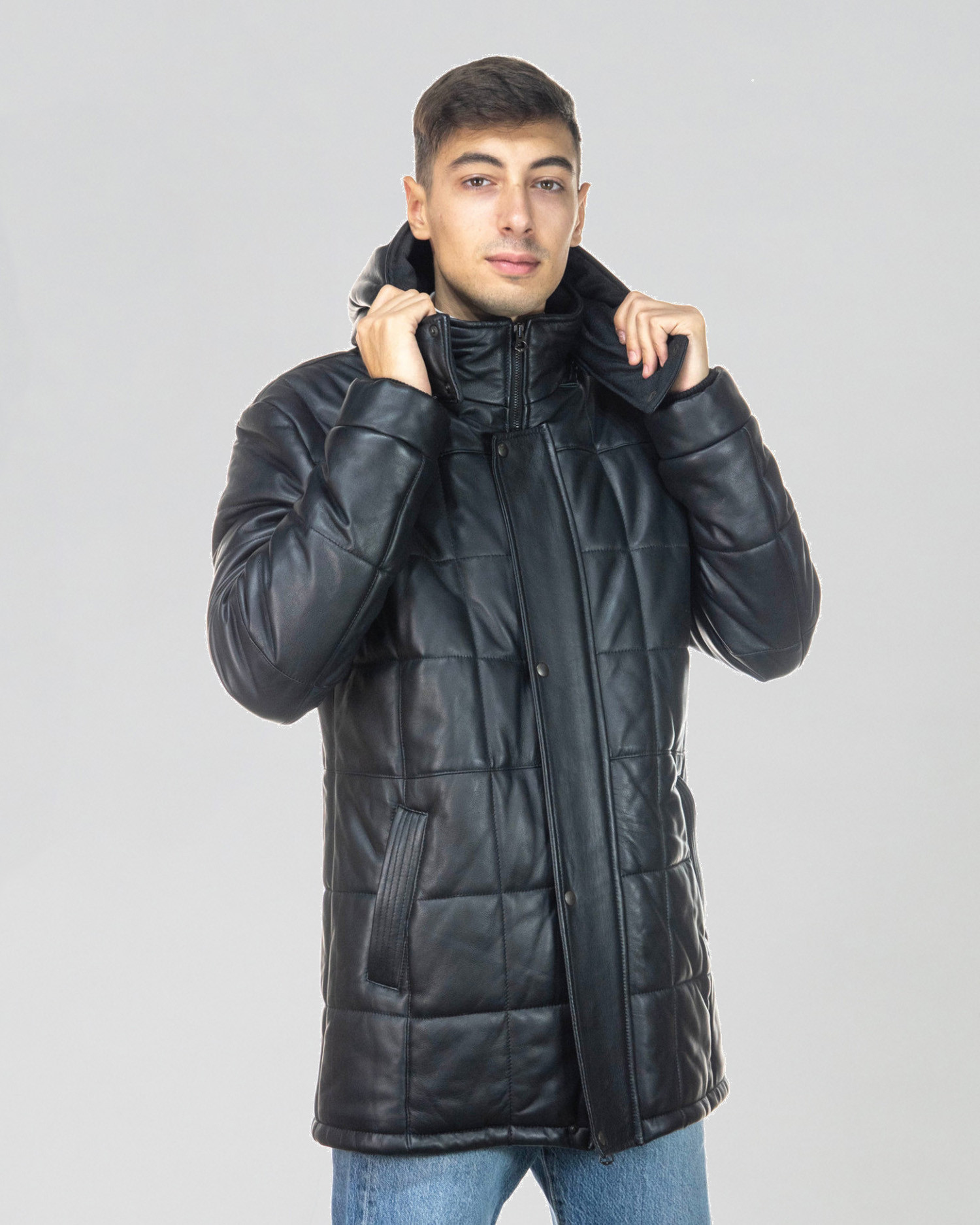 Men's down jacket made of genuine leather 100% made in Italy. The long down jacket model is a long men's jacket with a removable hood.