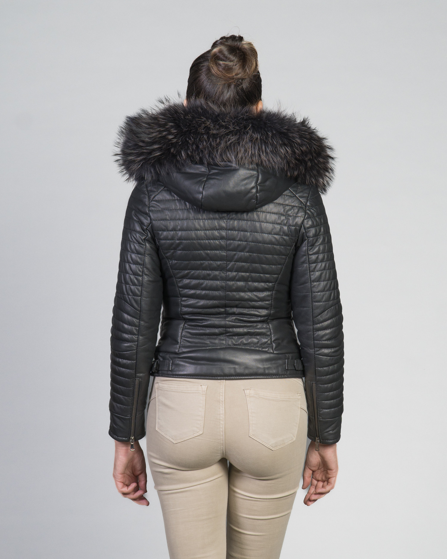 Woman down jacket with hood mod. Lasmara in genuine Black leather 100% made in Italy