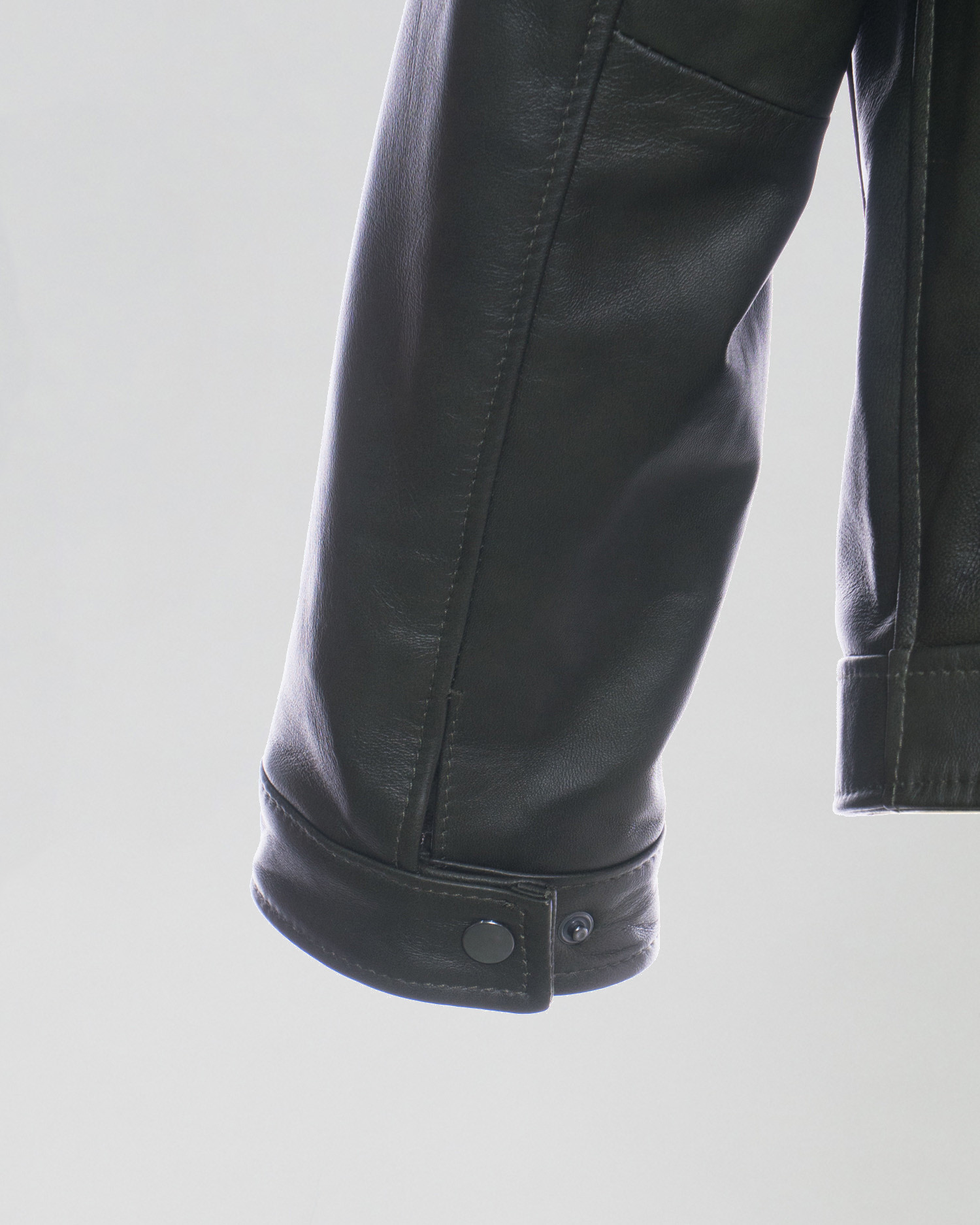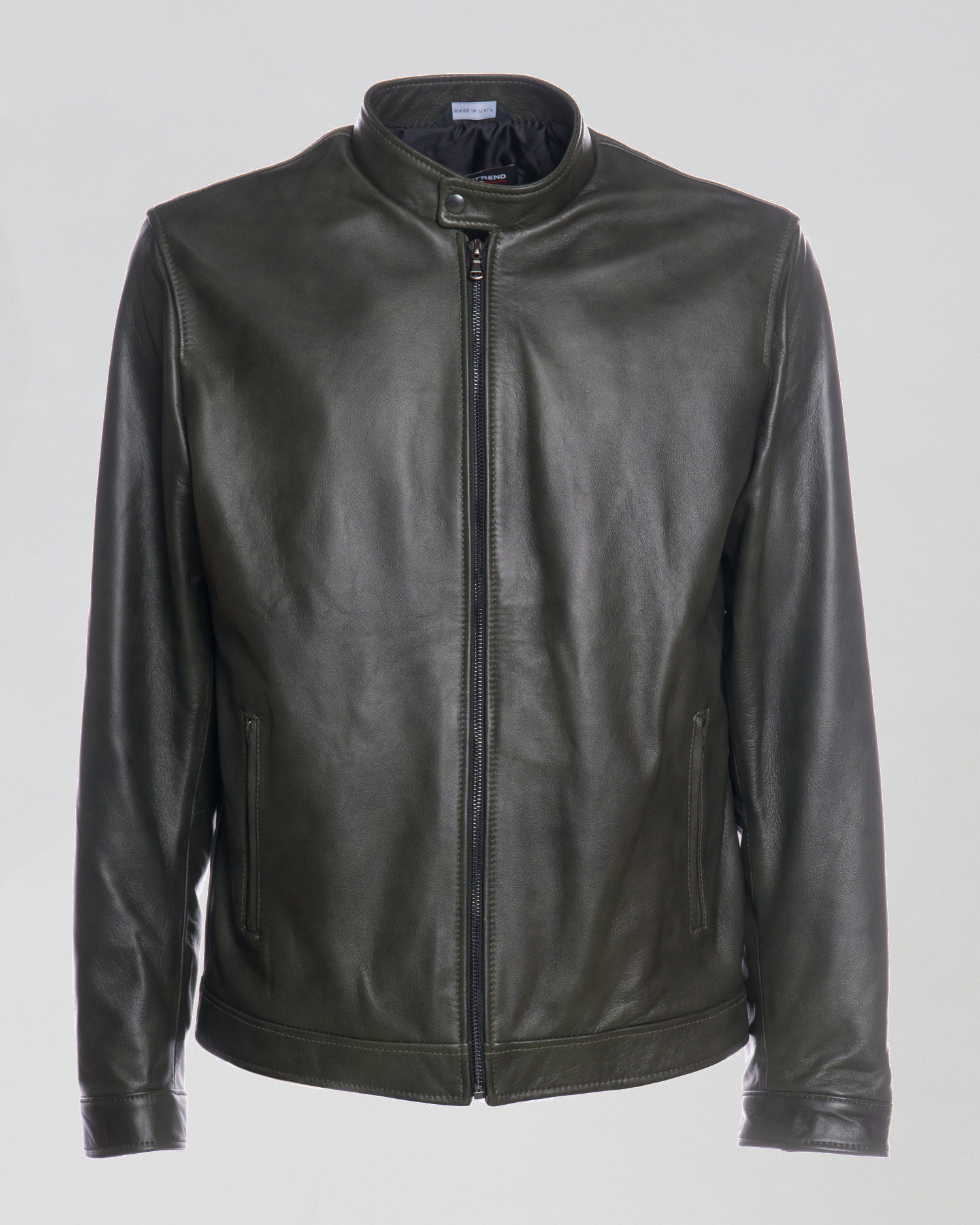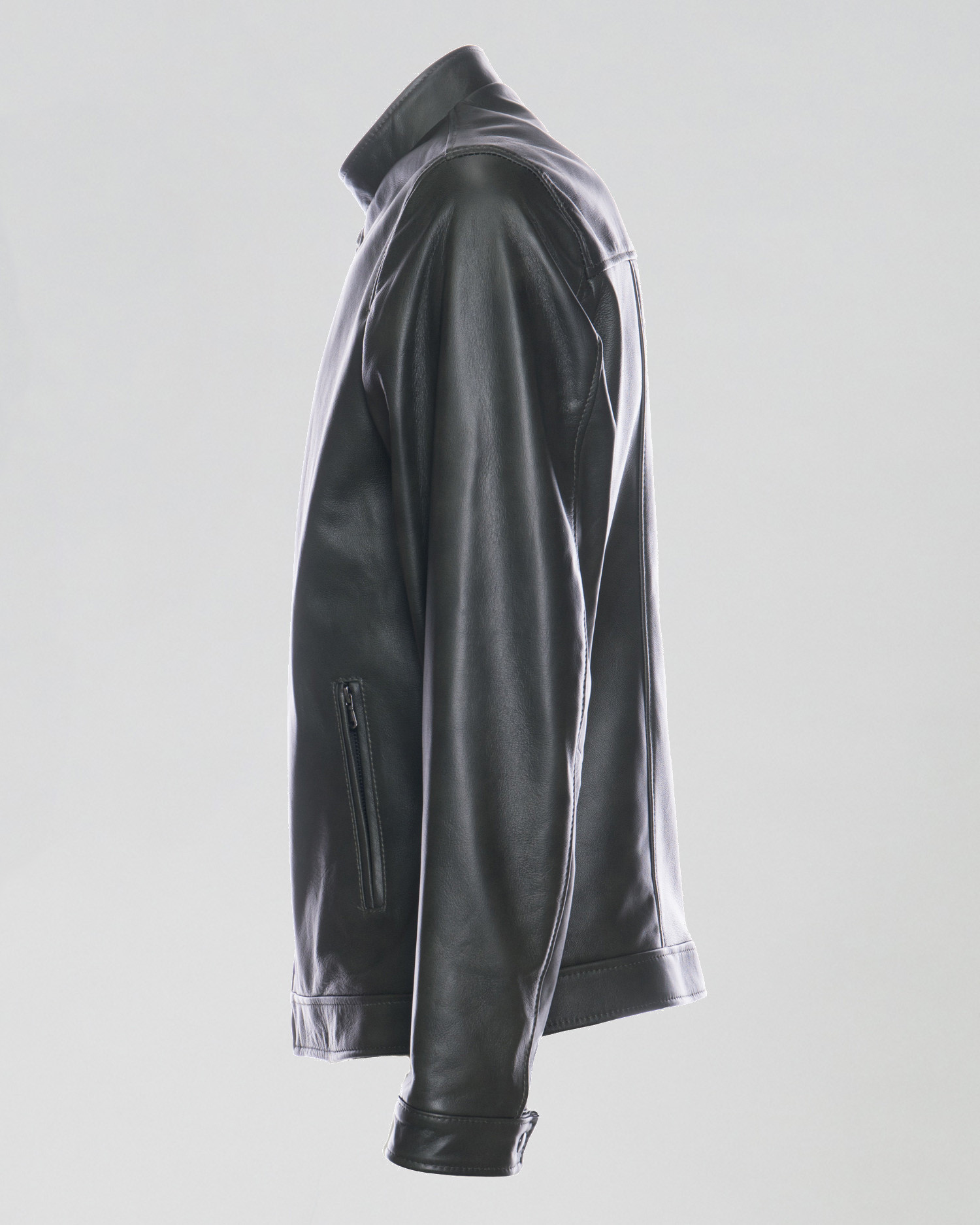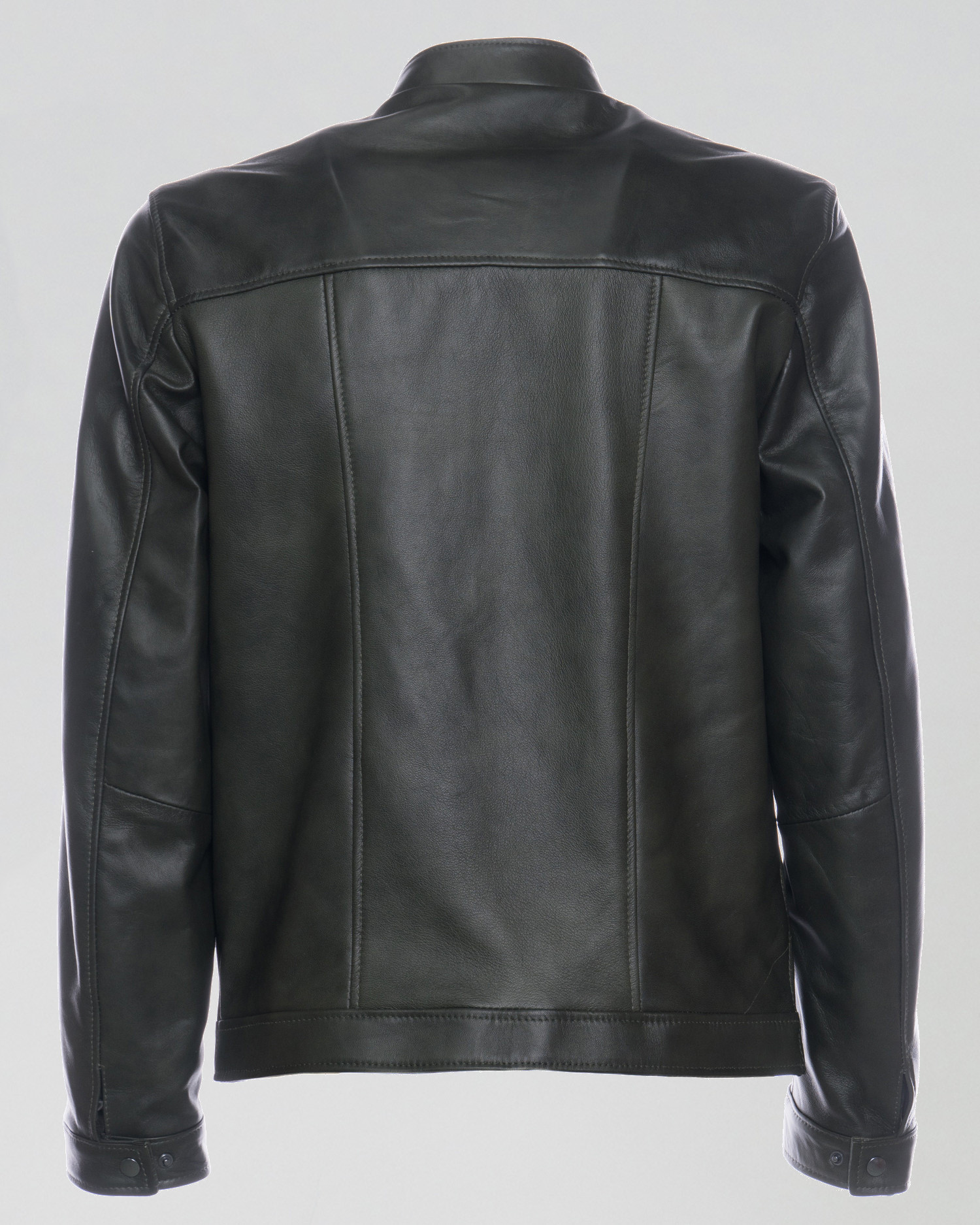 Leather jacket with a mandarin collar.