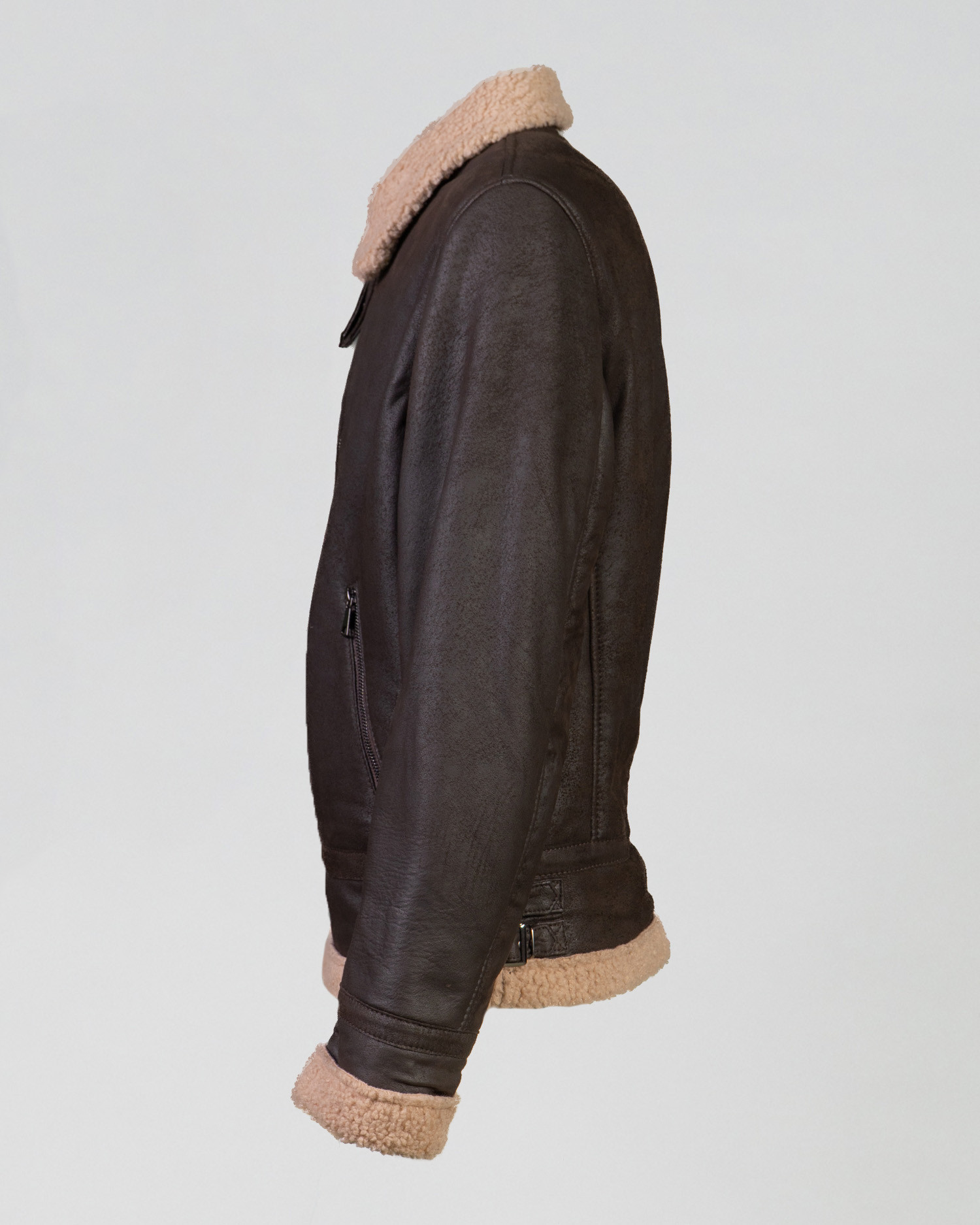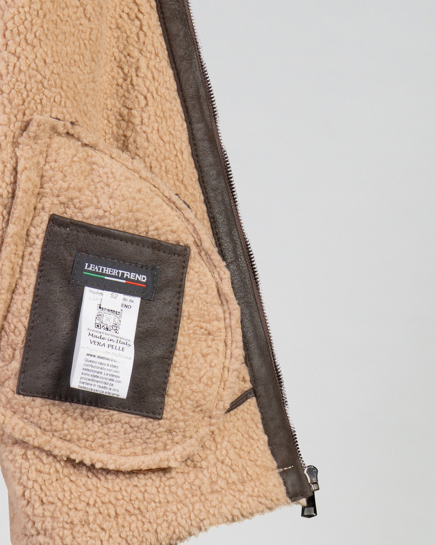 Genuine leather jacket, handcrafted with high quality leather. The exterior is leather, treated to ensure weather resistance and maintain softness over time. The interior and exposed details are Shearling effect, which offers excellent thermal insulation and comfort. The model features a high-lined collar, front closure with metal zip, edged cuffs and jacket hem for optimal grip. The side pockets are integrated with invisible zips and reinforced stitching. Regular fit, designed to guarantee freedom of movement. Ideal for cold climates, this jacket combines functionality and style, and is suitable for both urban and outdoor contexts. Produced entirely in Italy, with attention to detail and fine finishes.