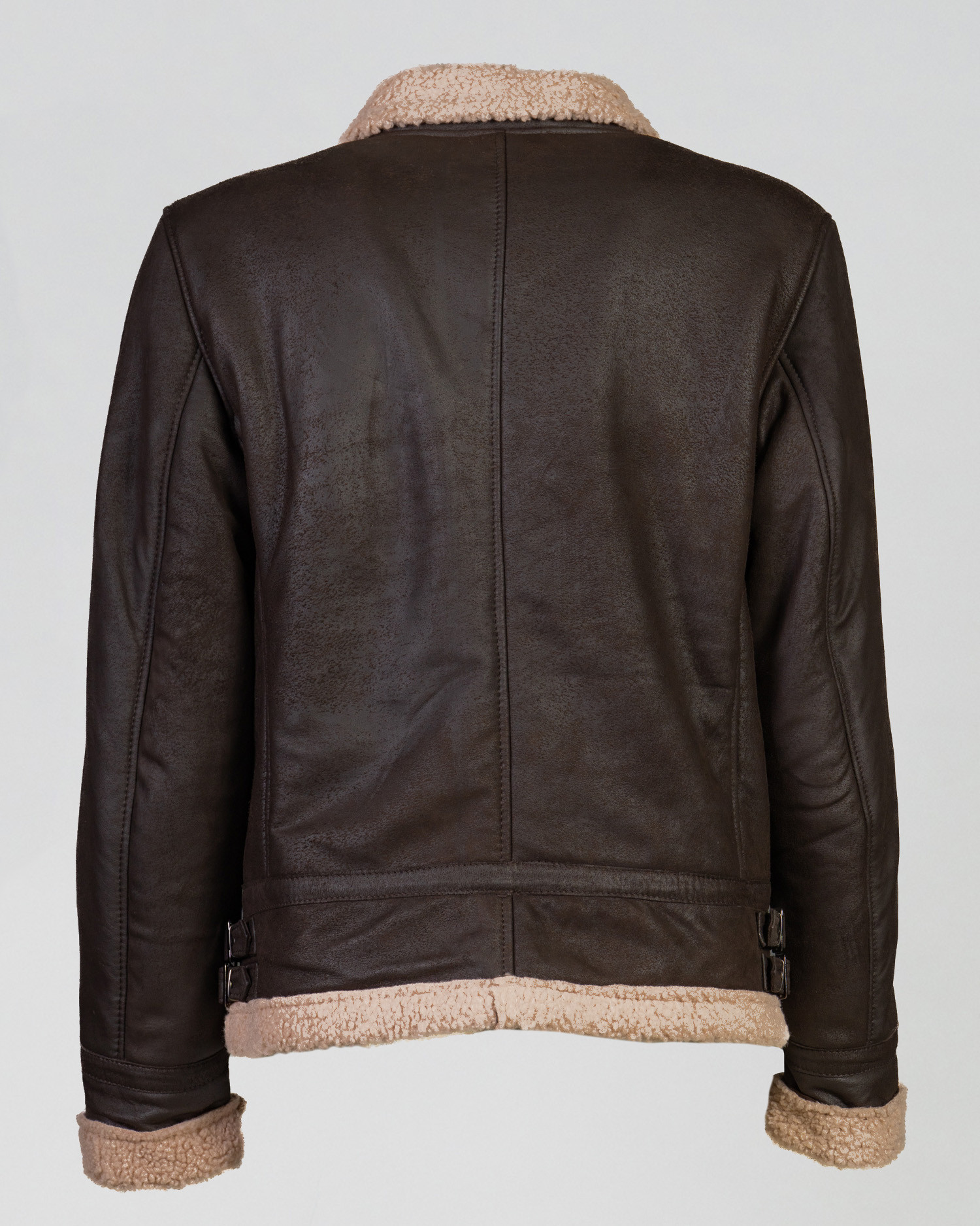 Genuine nubuck leather jacket with shearling effect details and interior.