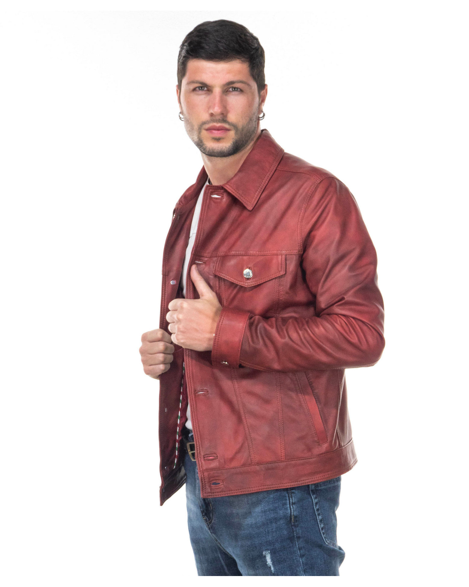 Men's denim-style leather jacket.