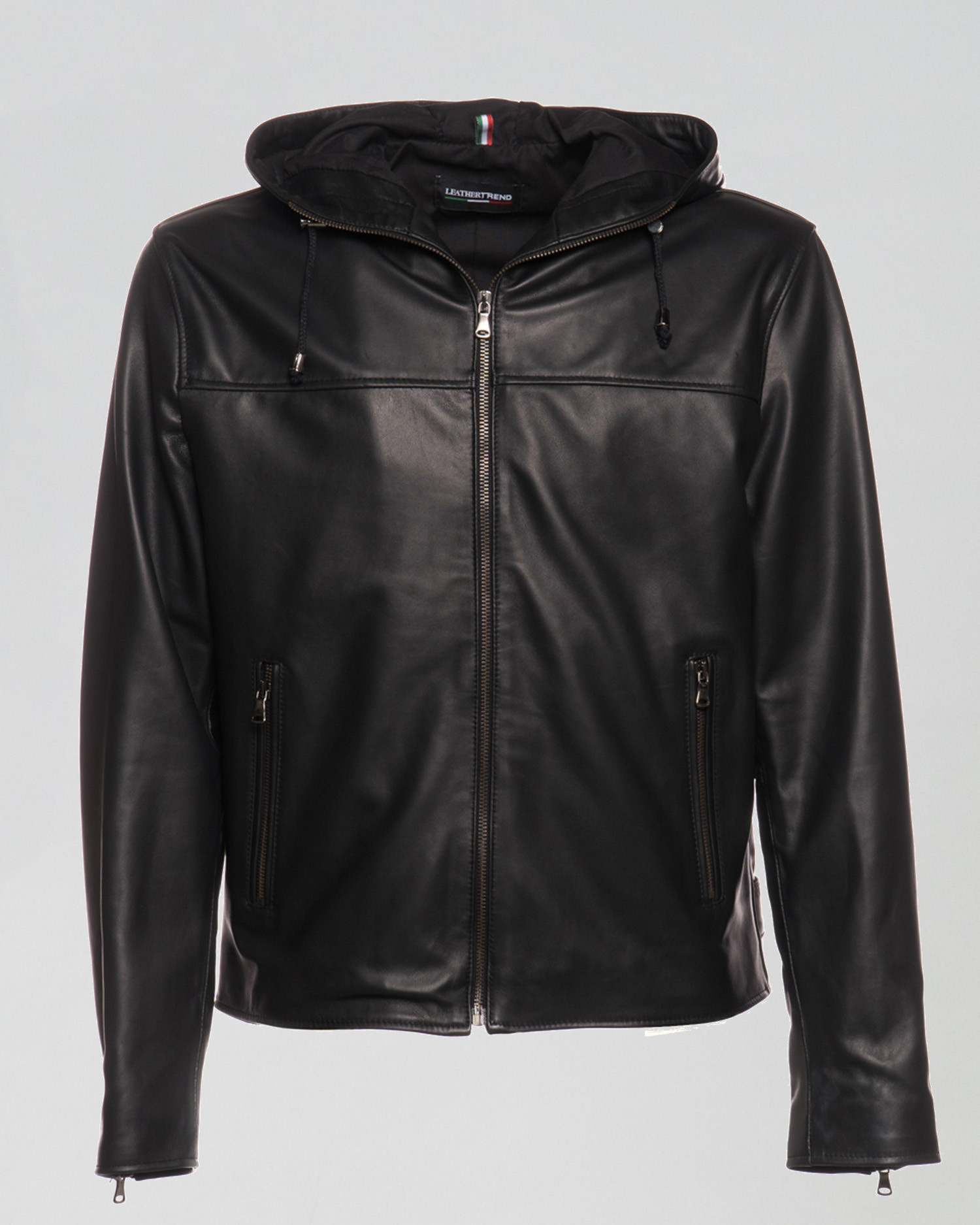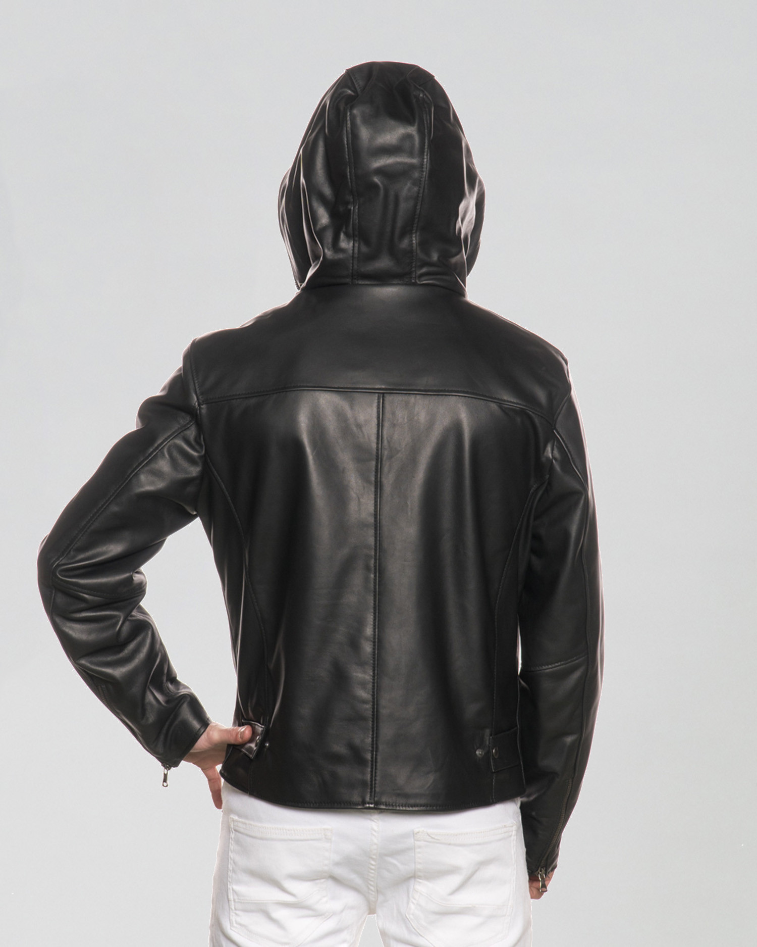Men's leather jacket with an adjustable hood.