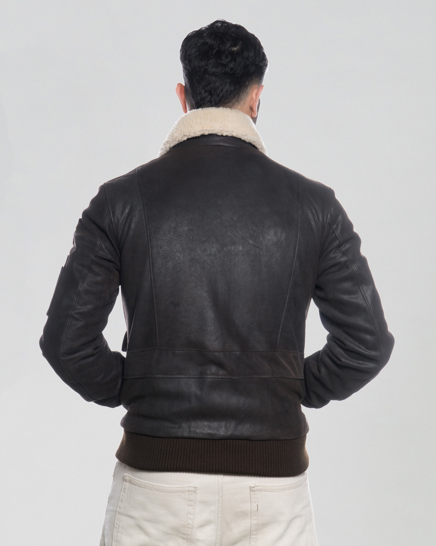 The genuine nubuck leather offers softness, durability, and a natural fit, while the elasticated cuffs and hem ensure comfort and a snug feel, and the shearling collar provides warmth and style. The front flap pockets add everyday practicality without compromising the refined design, enhanced by decorative patches that echo the heritage of pilot bomber jackets.