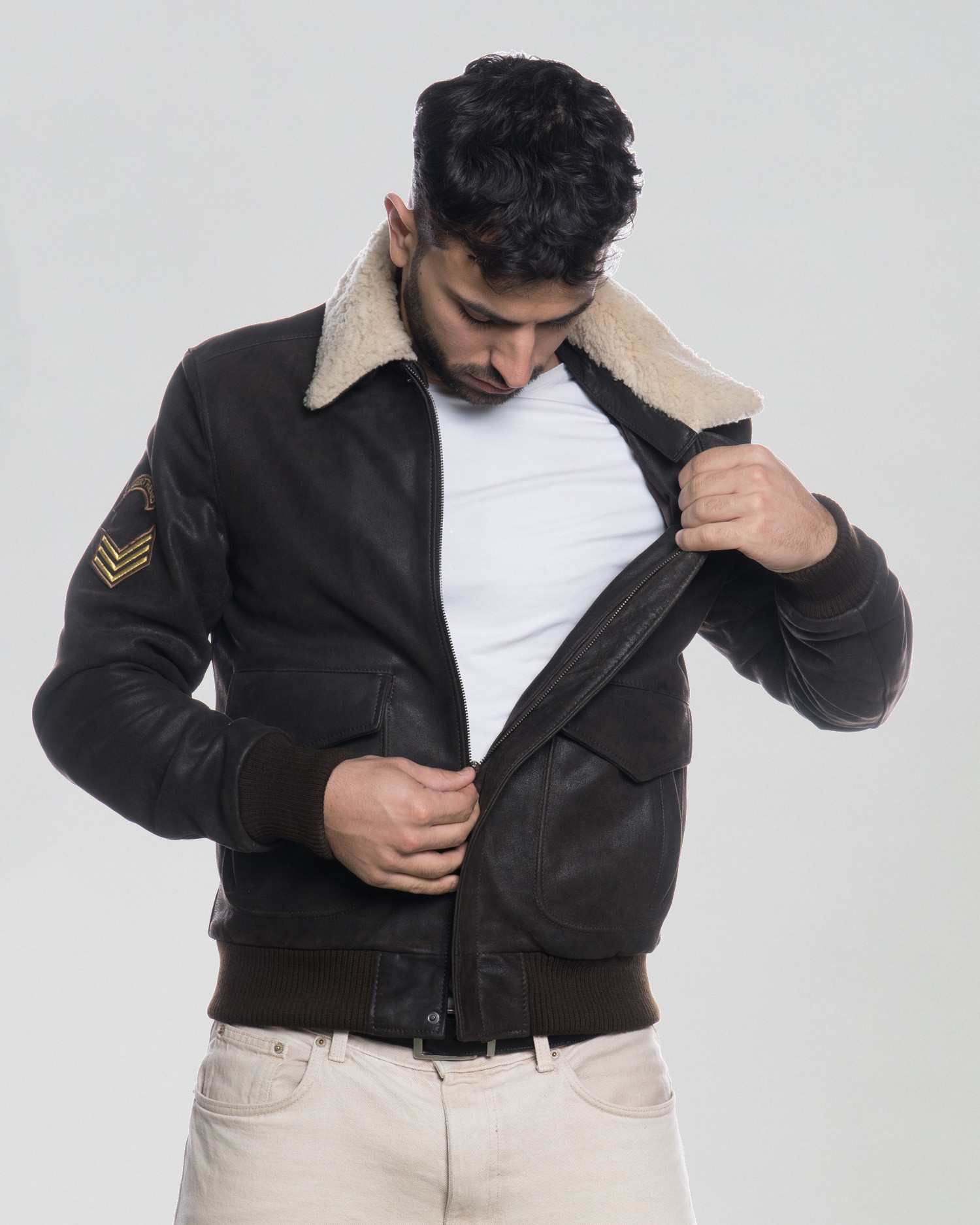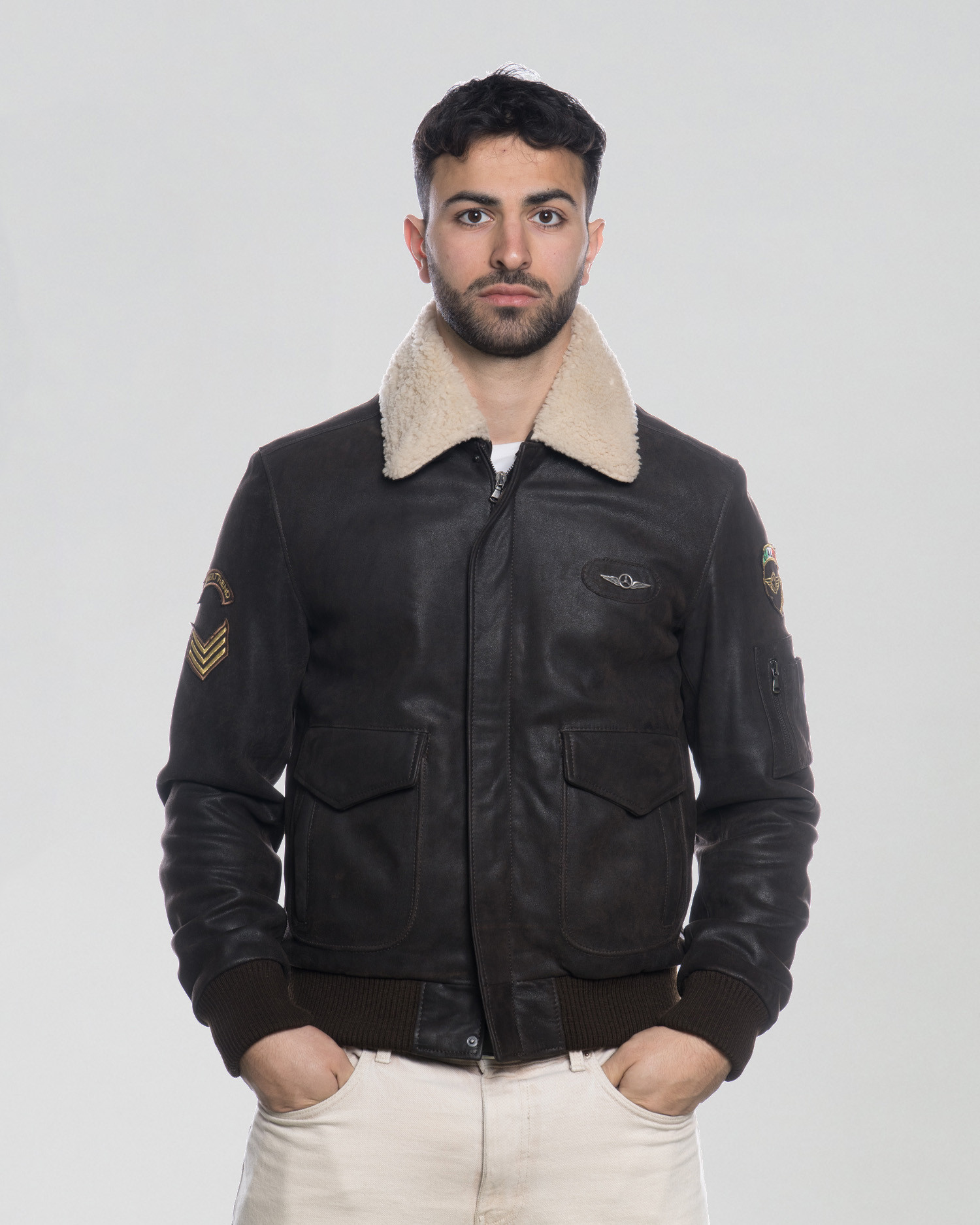 Aviator-style nubuck bomber jacket with shearling collar and decorative patches.