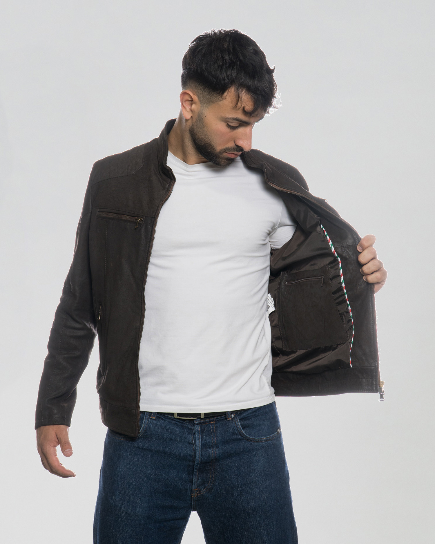 Let yourself be won over by the strong charm of our real leather jacket, a garment that combines elegance and rebellious spirit. Made of natural leather with a shiny finish, this jacket is designed for those who love to stand out in style. The slim fit cut enhances the silhouette, while the high collar and metal zips give a modern and bold touch.
