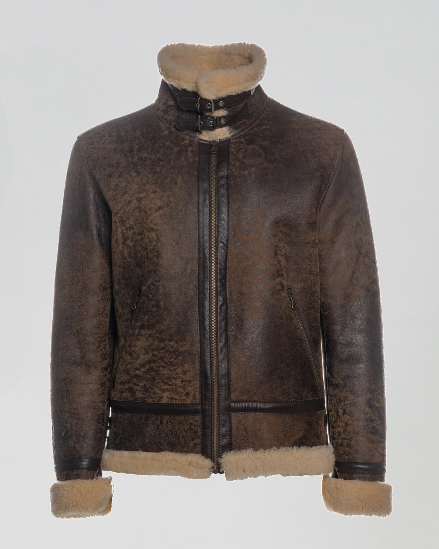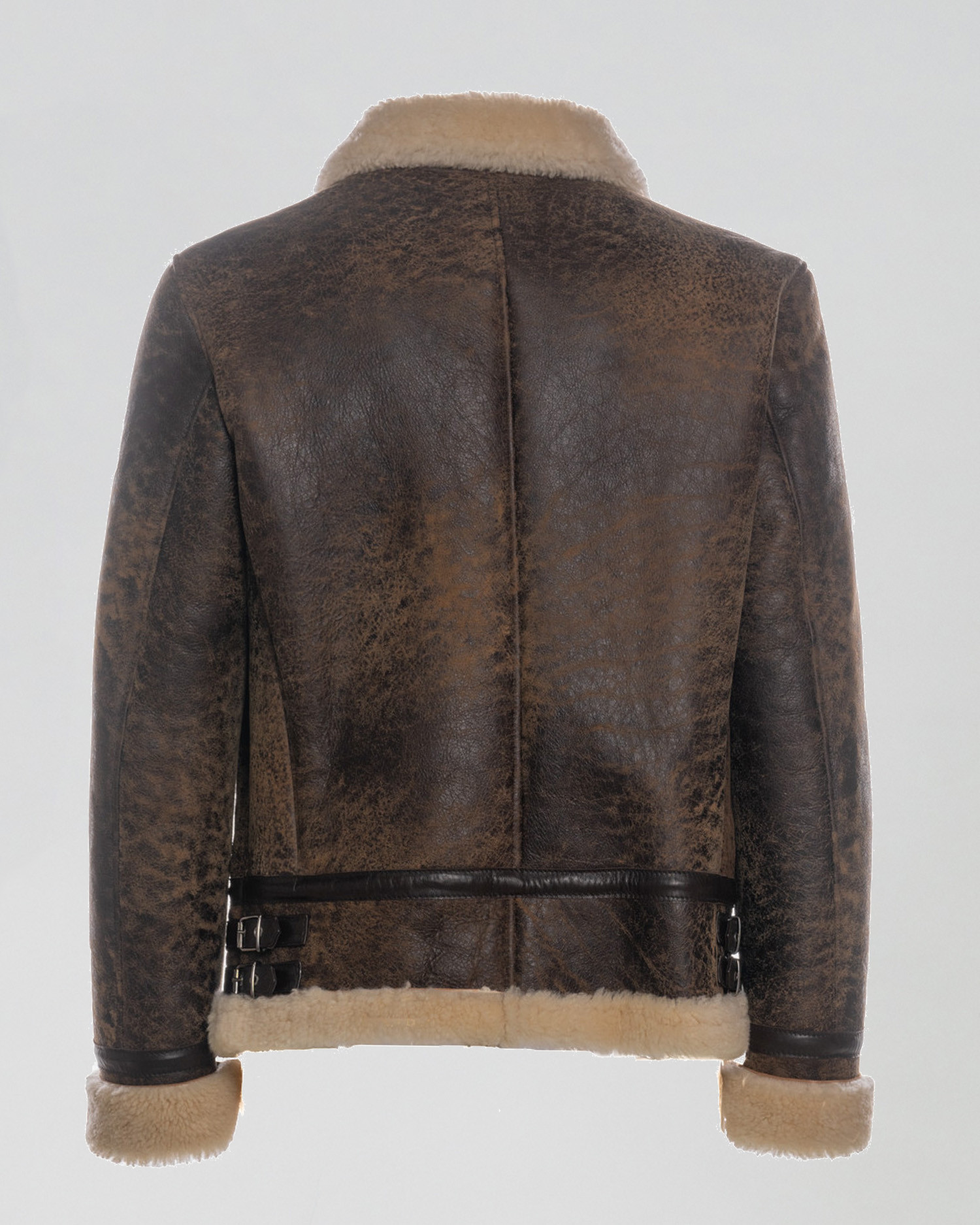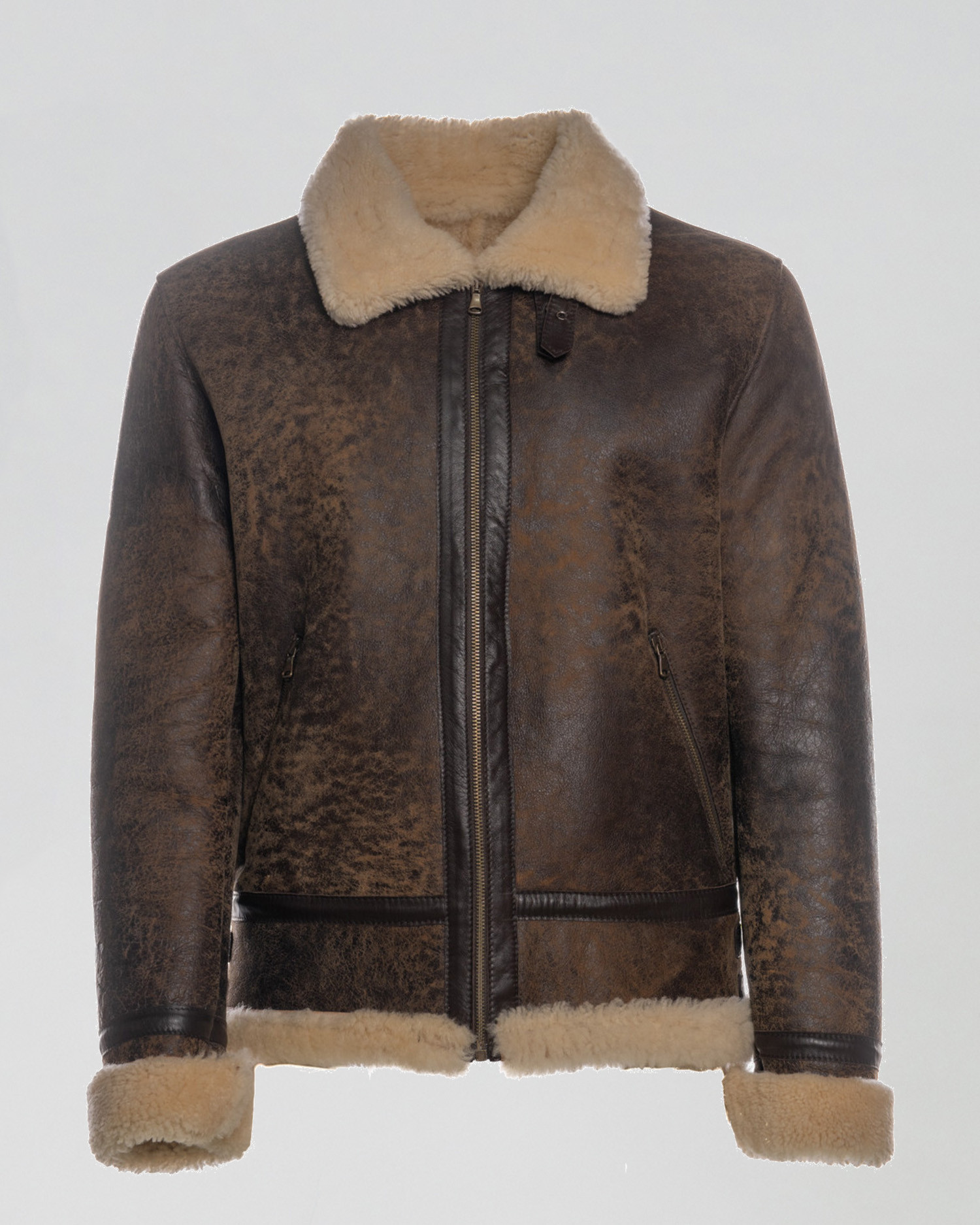 Genuine shearling sheepskin jacket with distressed beige finish.