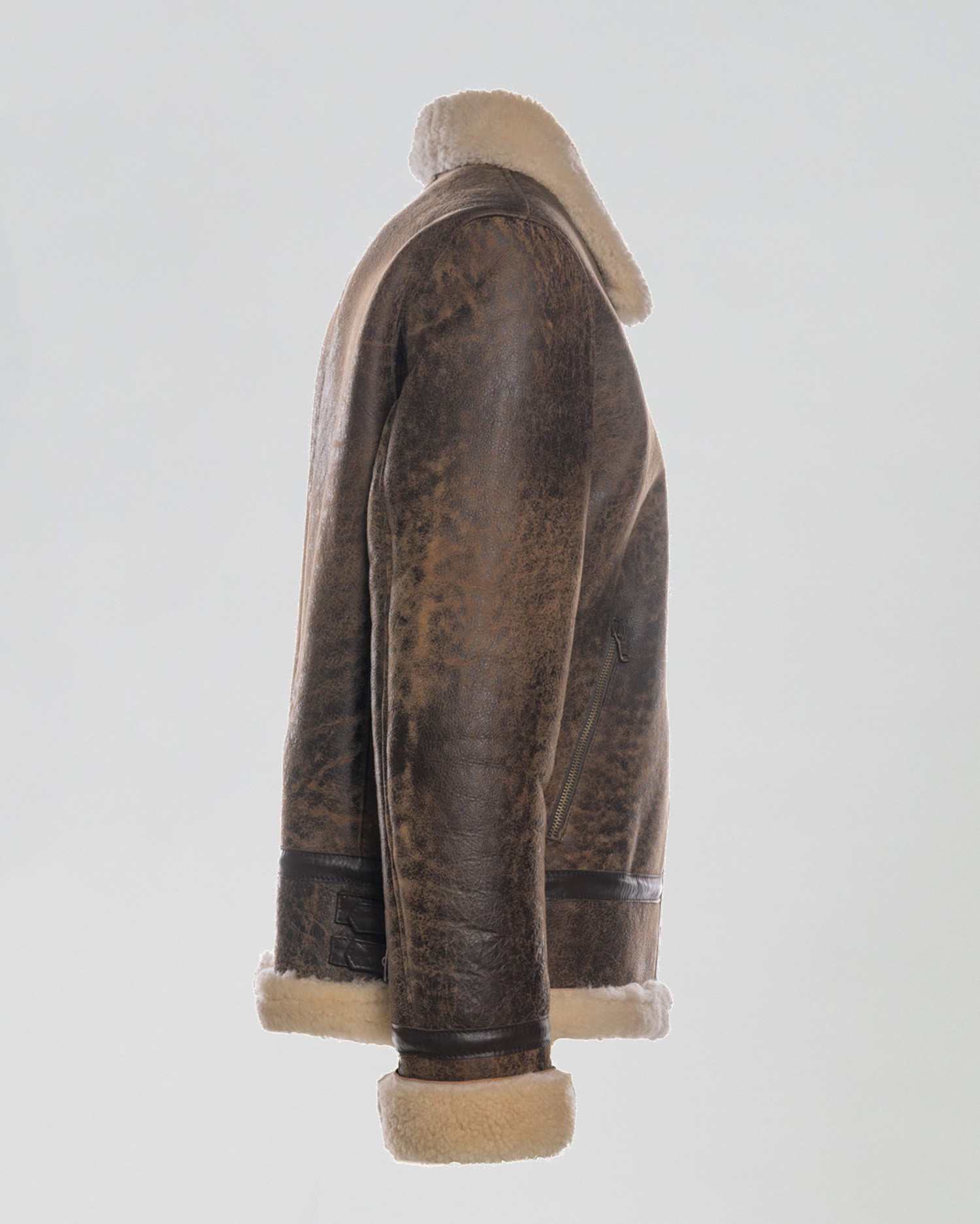 Crafted from genuine shearling sheepskin, it pairs a durable leather exterior with a natural wool interior, ensuring optimal thermal insulation. The scratched-effect beige finish gives the jacket an authentic, lived-in look that becomes more distinctive over time.