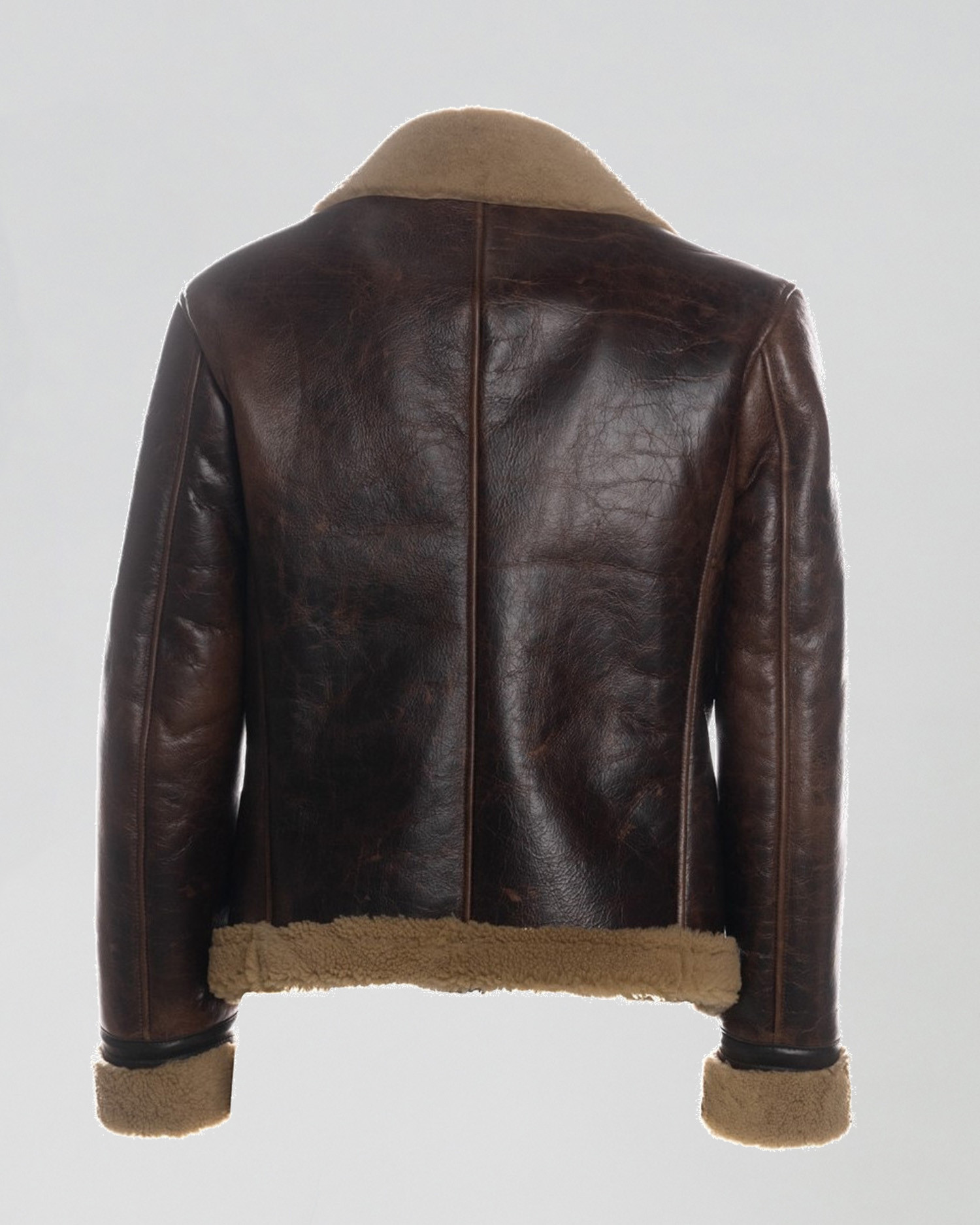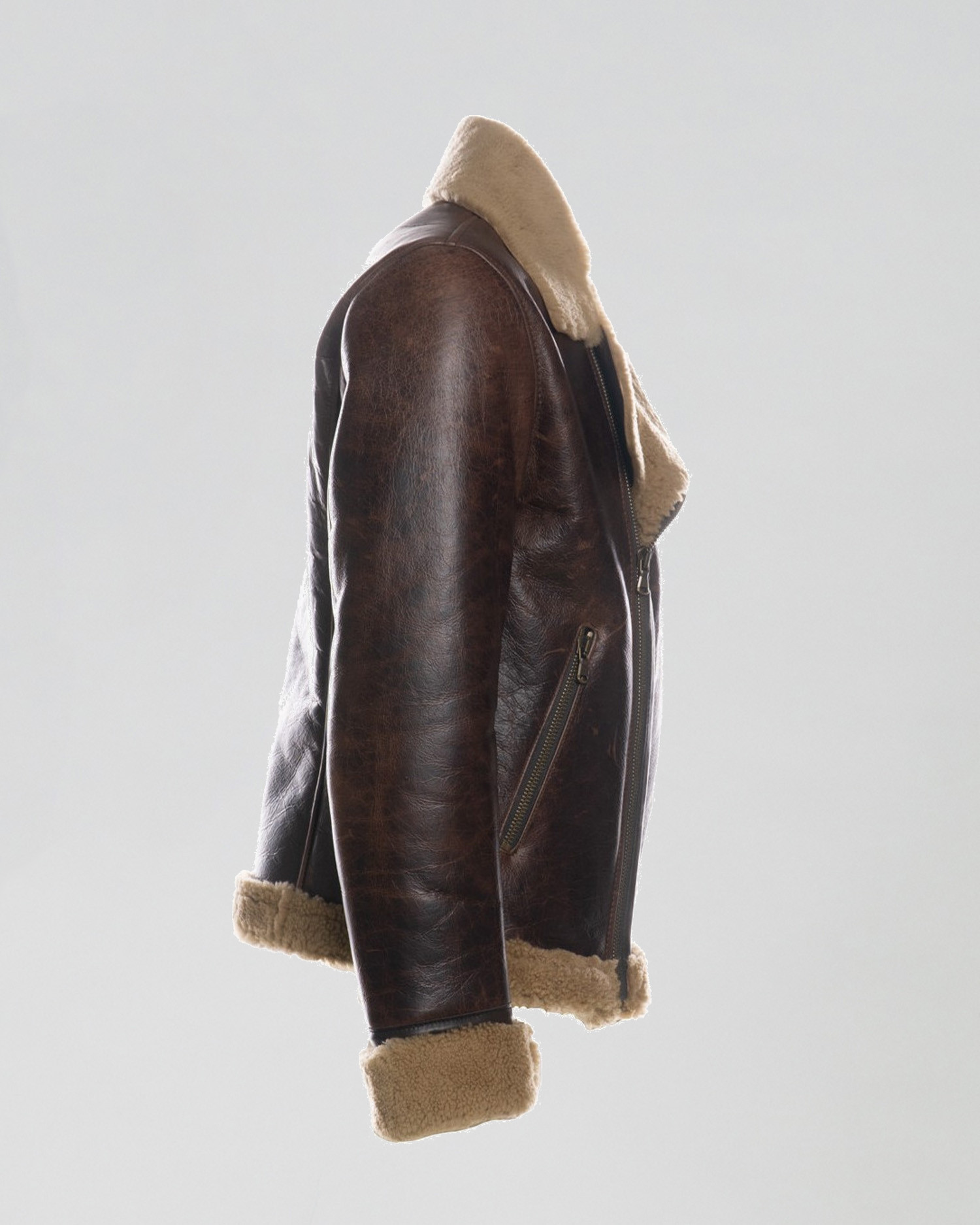 Made from shearling sheepskin, this jacket is the perfect balance between functionality and style. The aviator design with wide collar, front zip and zip pockets gives a bold and timeless look. Sheepskin visible on the neck, cuffs and bottom adds comfort and character.