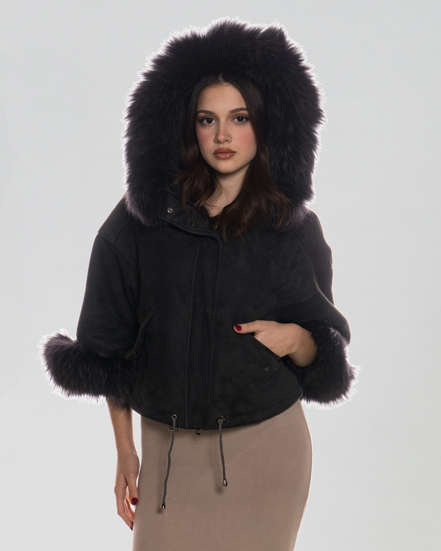 The Bea shearling jacket is designed to keep you stylish during the coldest days. Its modern cropped design and light green color with tone-on-tone details add a contemporary touch, while the real fox fur on the hood and cuffs brings elegance and extra warmth.