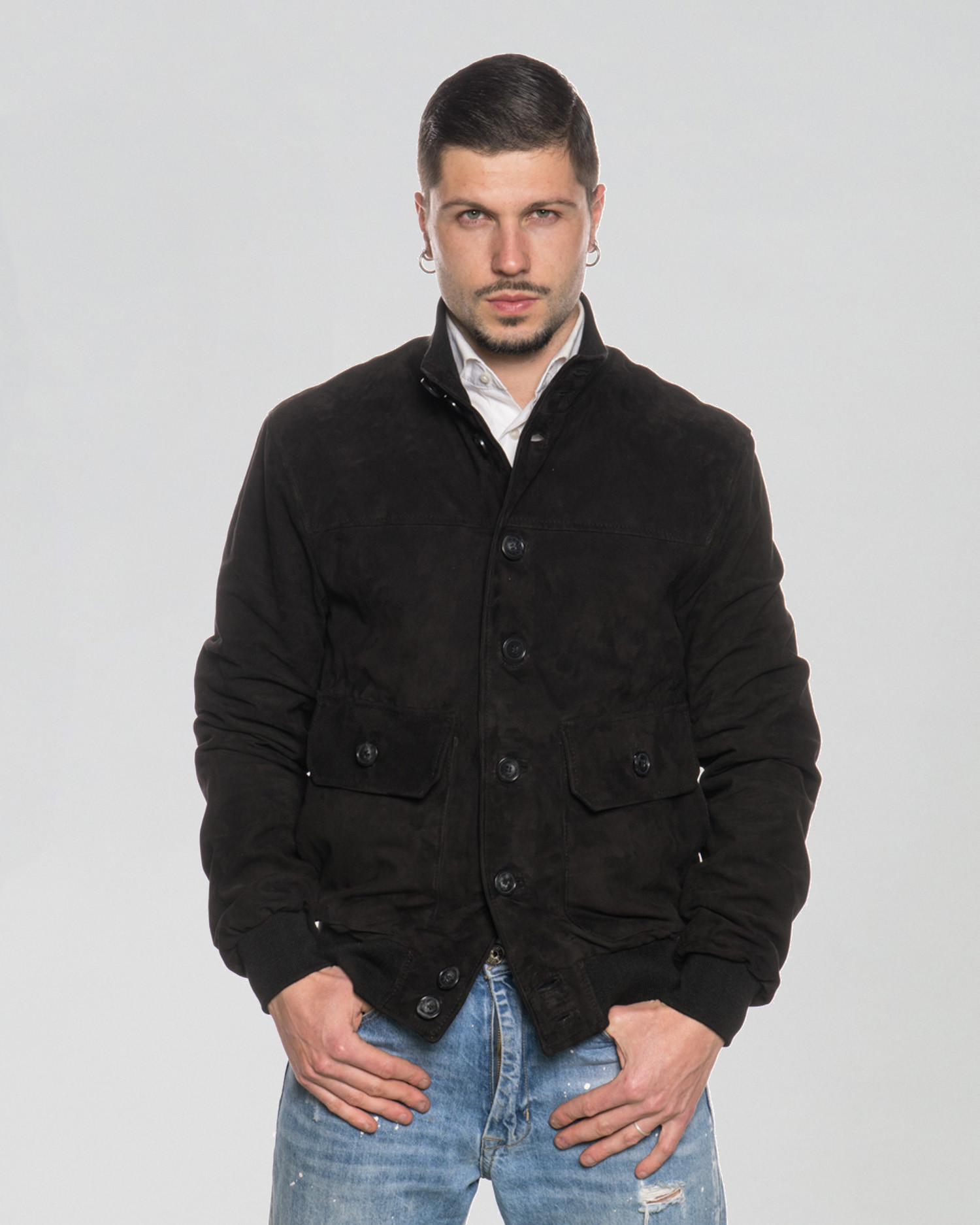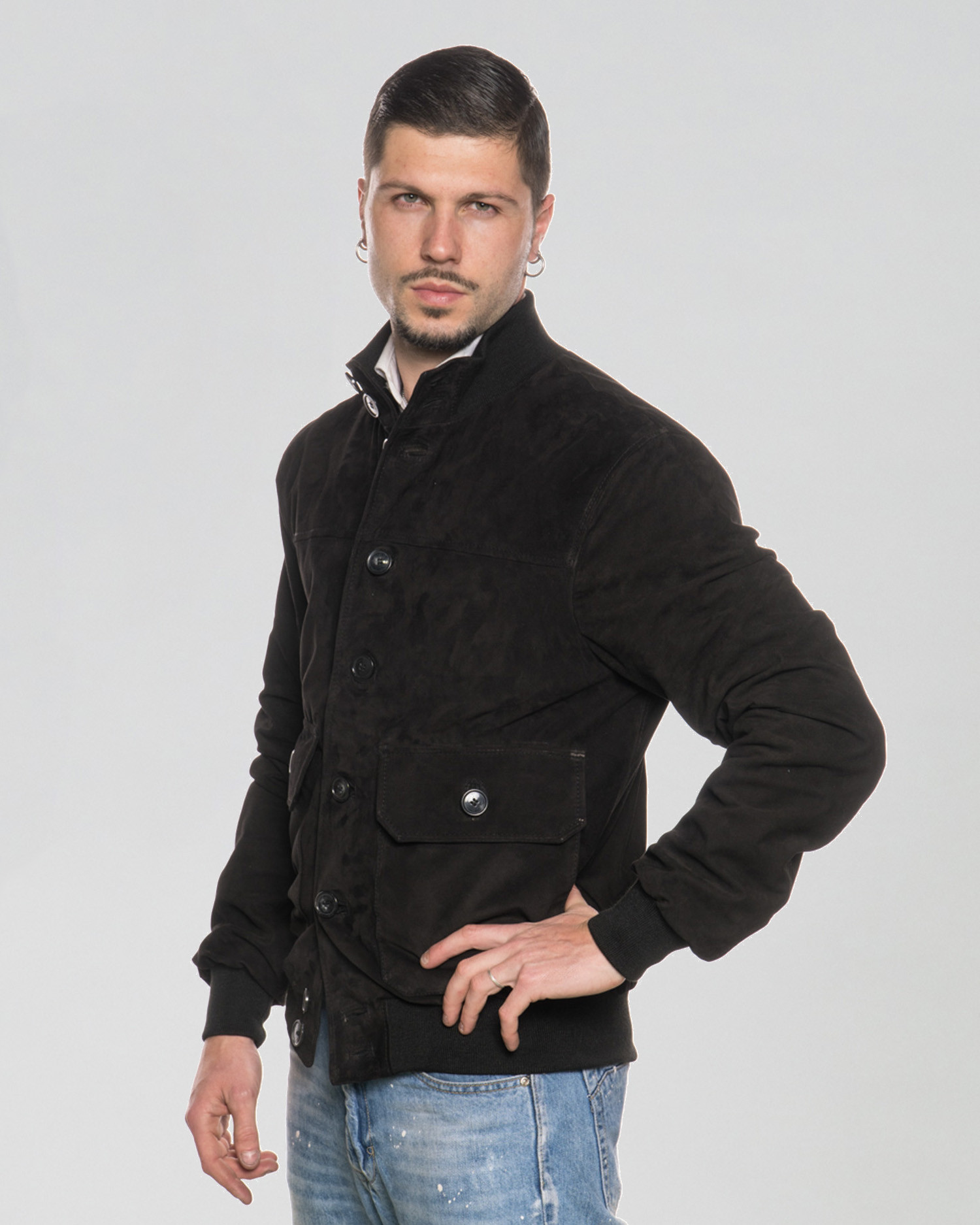 Men's suede bomber jacket with button closure and elastic fabric at the cuffs and collar.