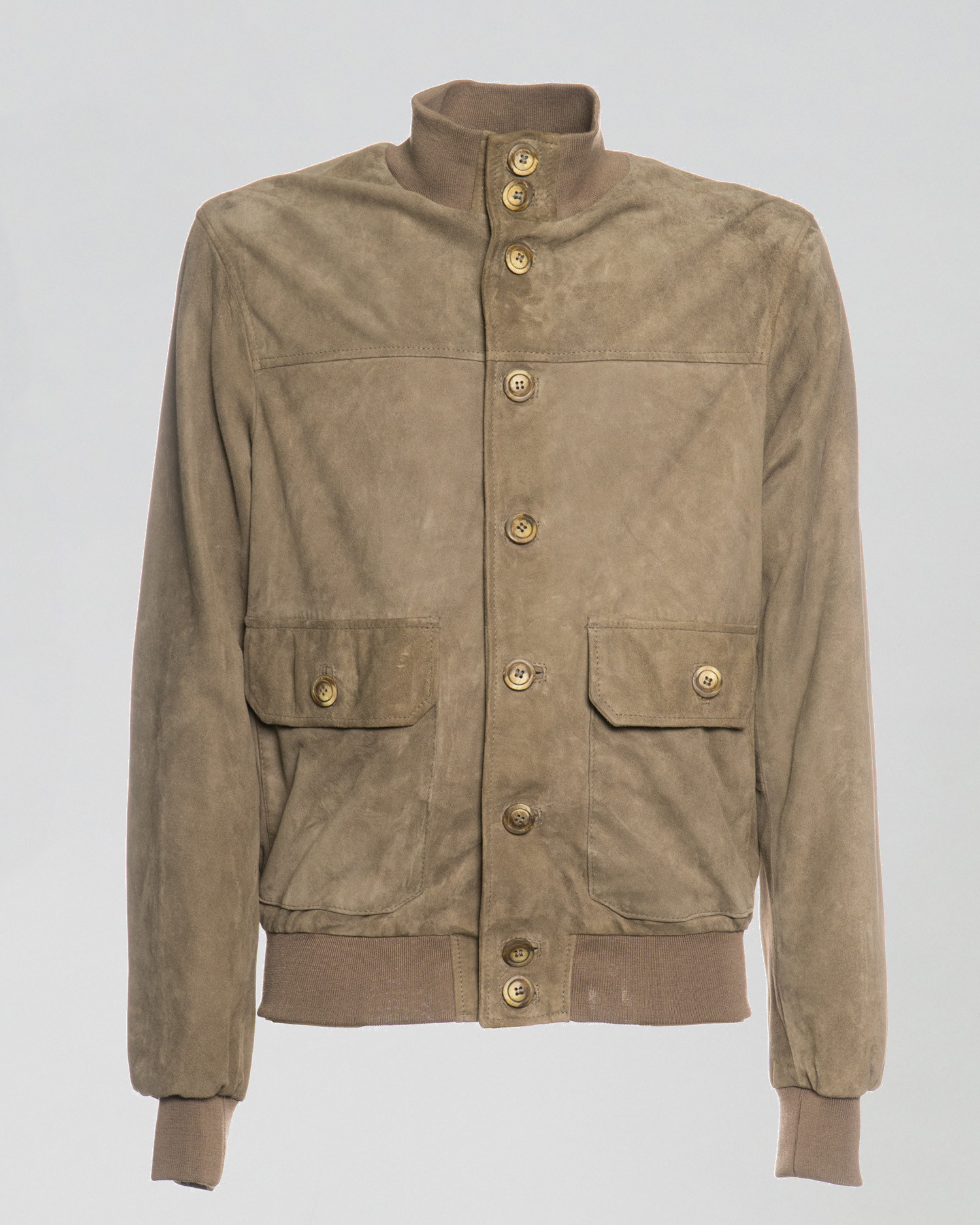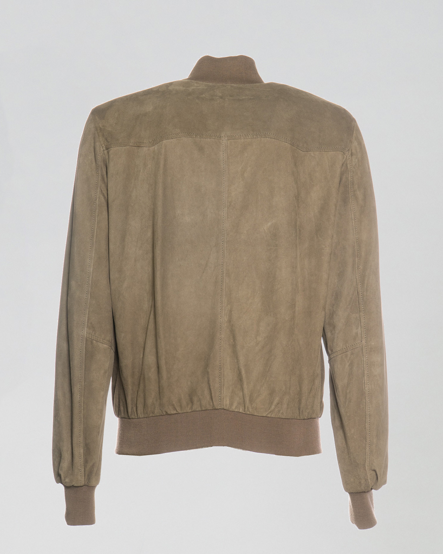 Men's suede bomber jacket with button closure and elastic fabric at the cuffs and collar.