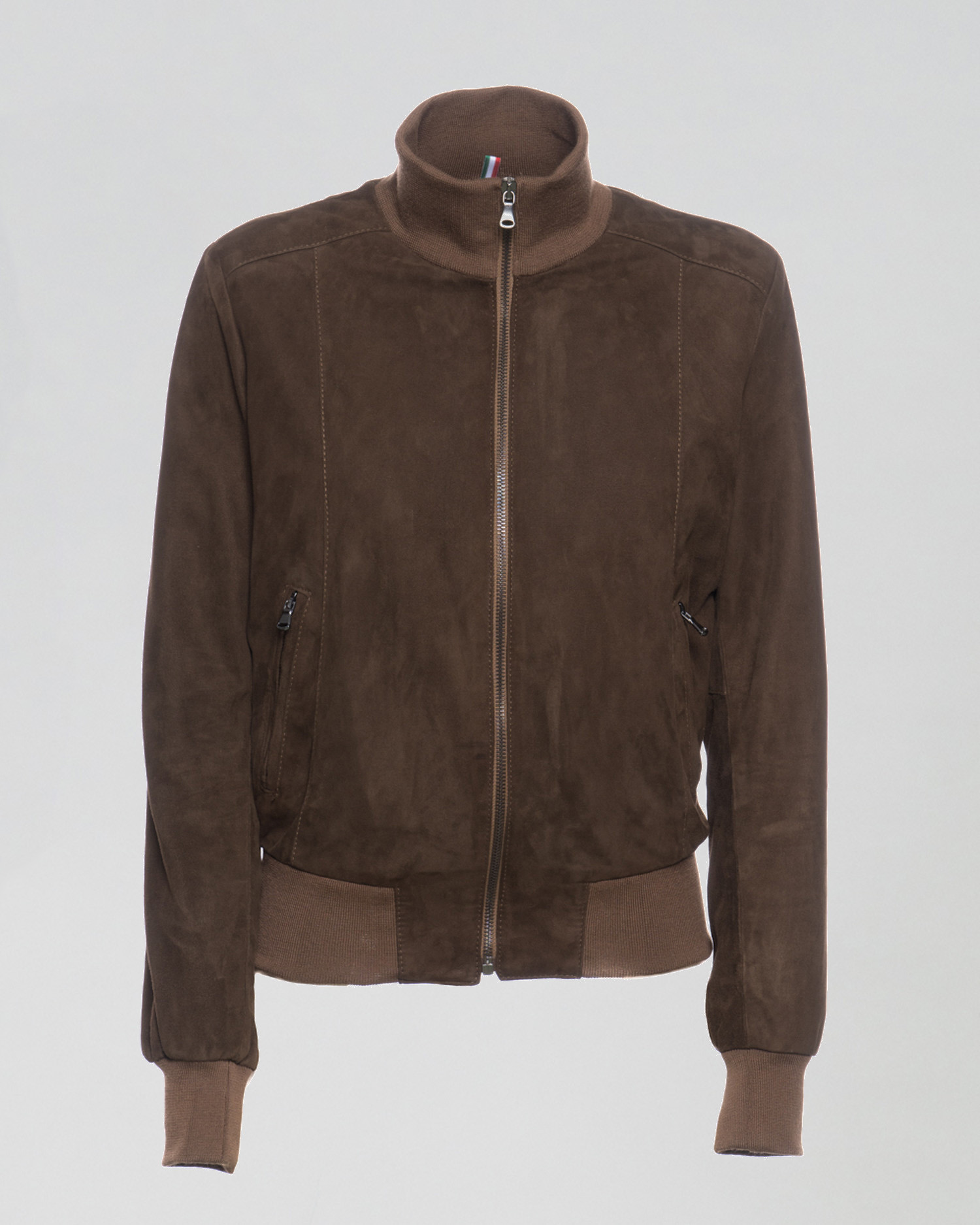 Suede bomber jacket with elastic knit collar, cuffs and hem.