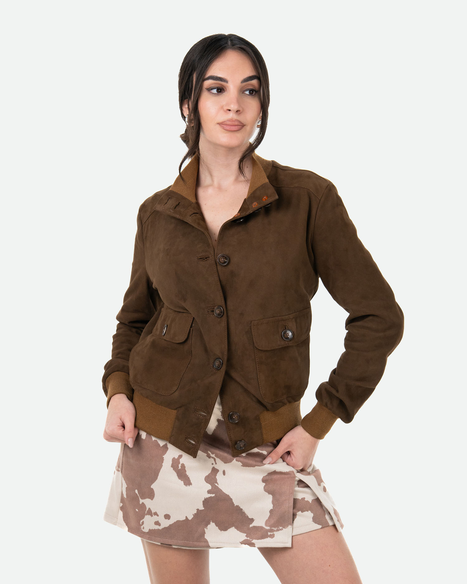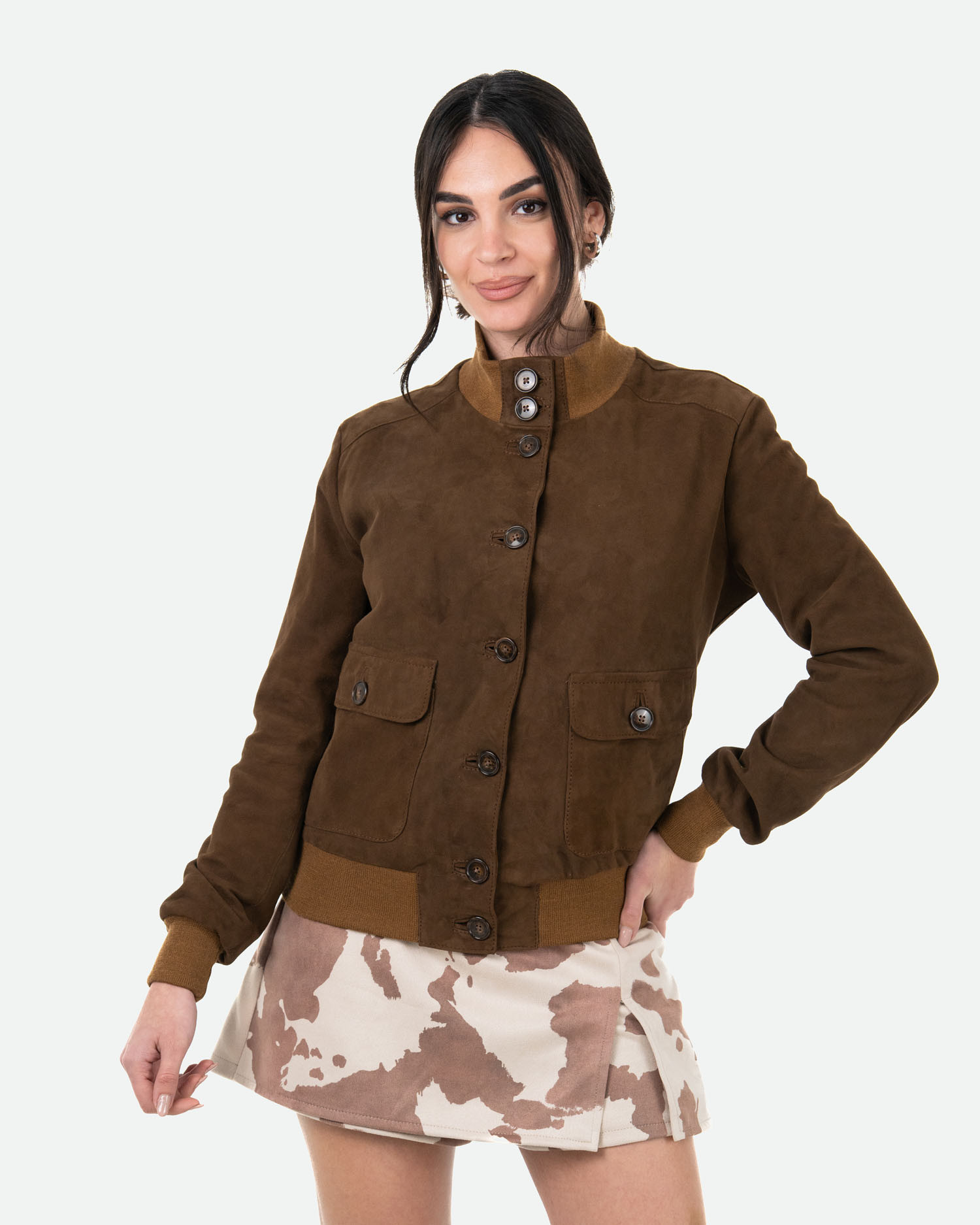 Women's suede bomber jacket with an elasticated collar, cuffs and hem.