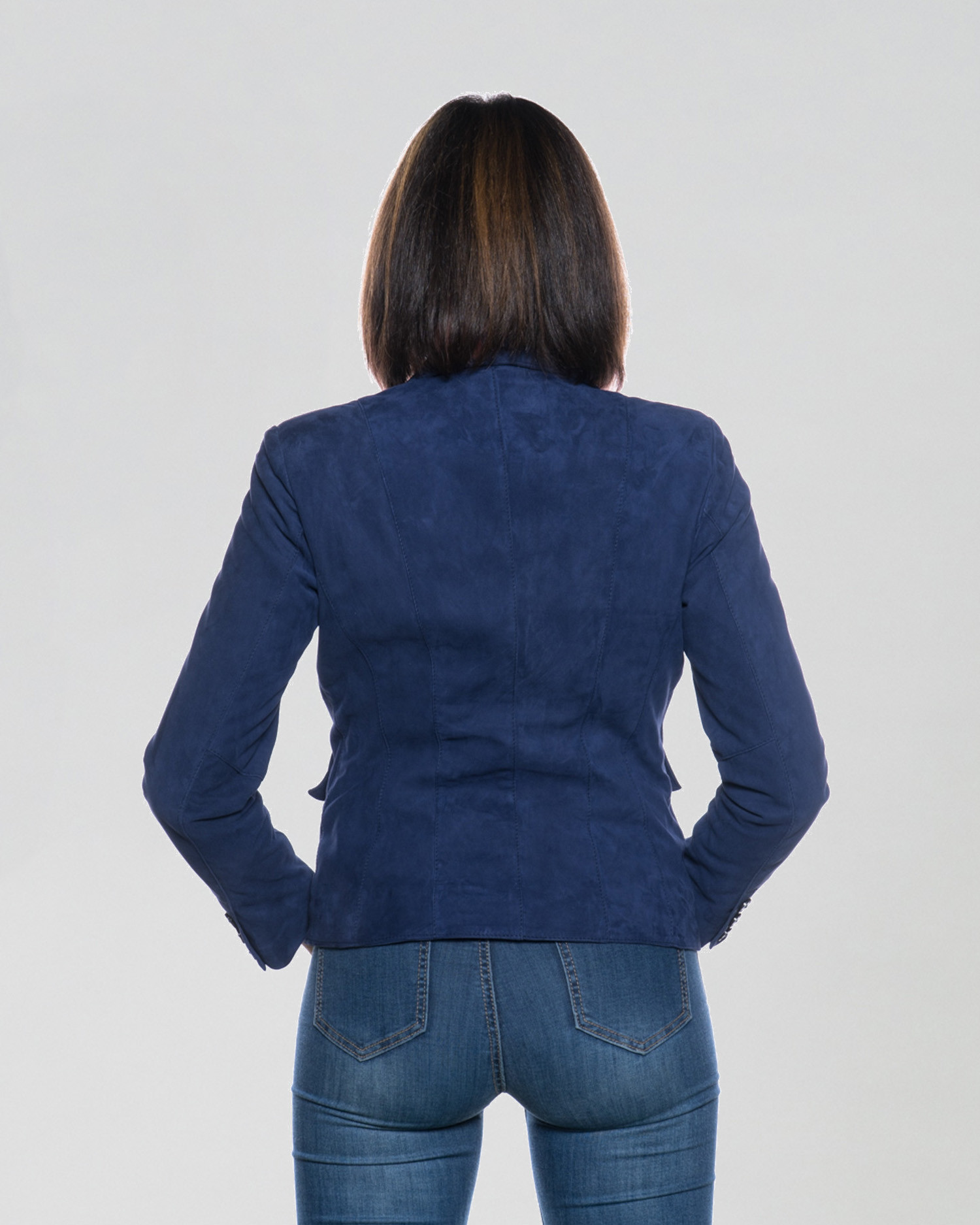 Crafted from genuine suede leather, soft to the touch and resistant to everyday wear, this women’s leather jacket is perfect for transitional seasons. The warm and sophisticated blue shade brightens any outfit and pairs effortlessly with both formal looks and more casual combinations.