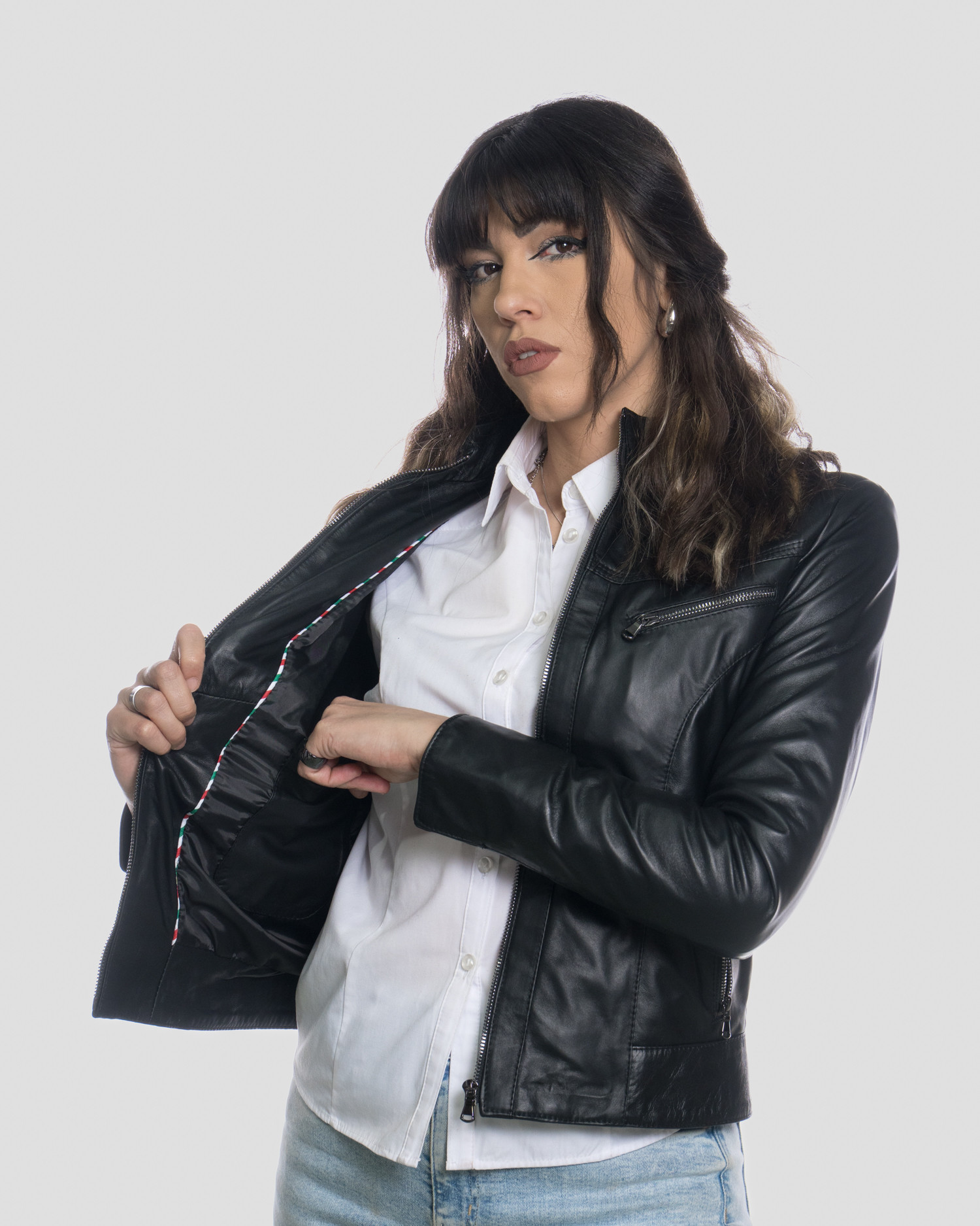 Questa giacca in vera pelle nera unisce praticità e carattere in un design moderno e strutturato. Il collo alto, le zip metalliche e le tasche multiple donano al capo un’estetica dinamica e funzionale. La pelle liscia e resistente garantisce comfort e durata, mentre la vestibilità regolare si adatta perfettamente alla silhouette.