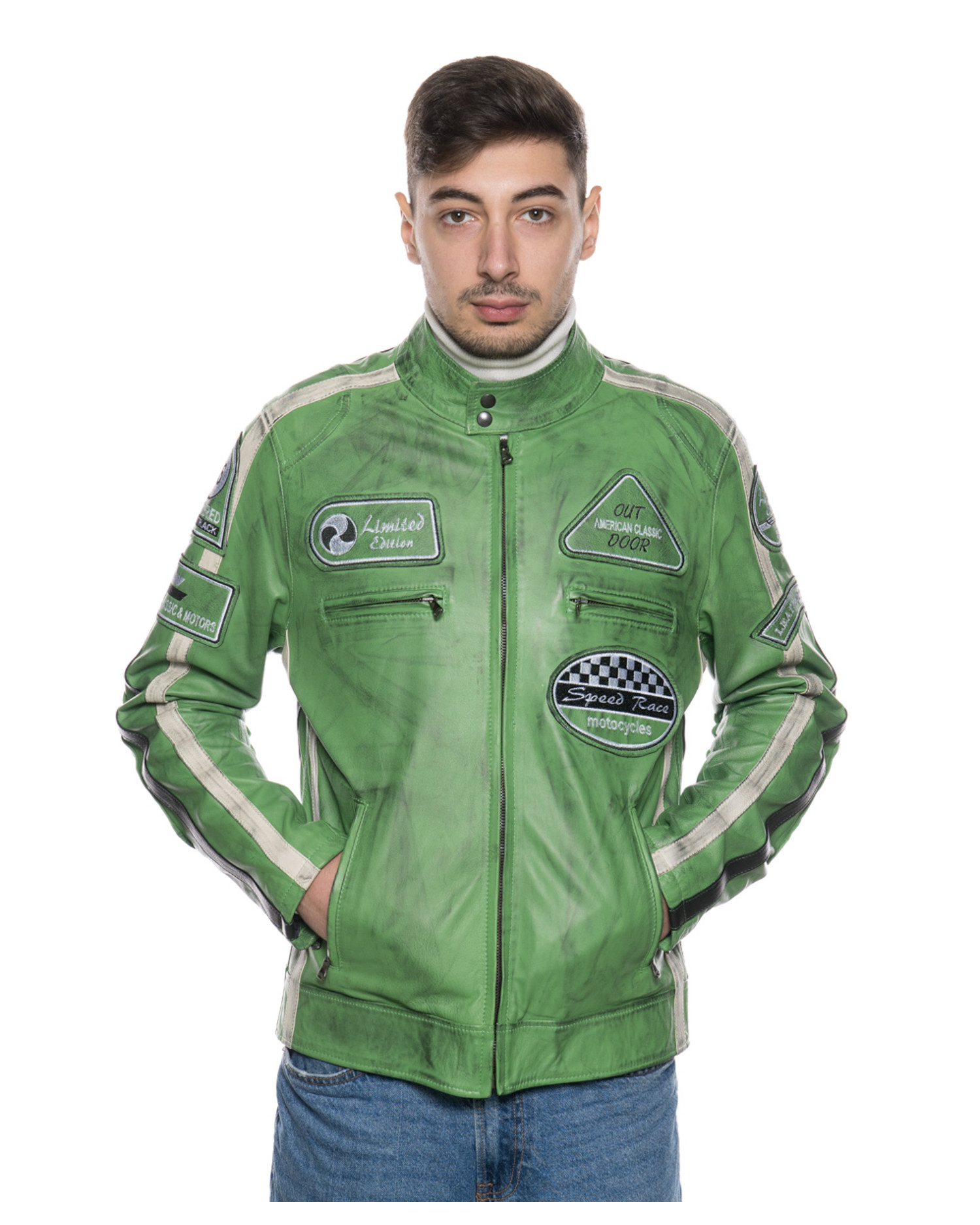 Biker in pelle da uomo stile motociclista con patch in rilievo.