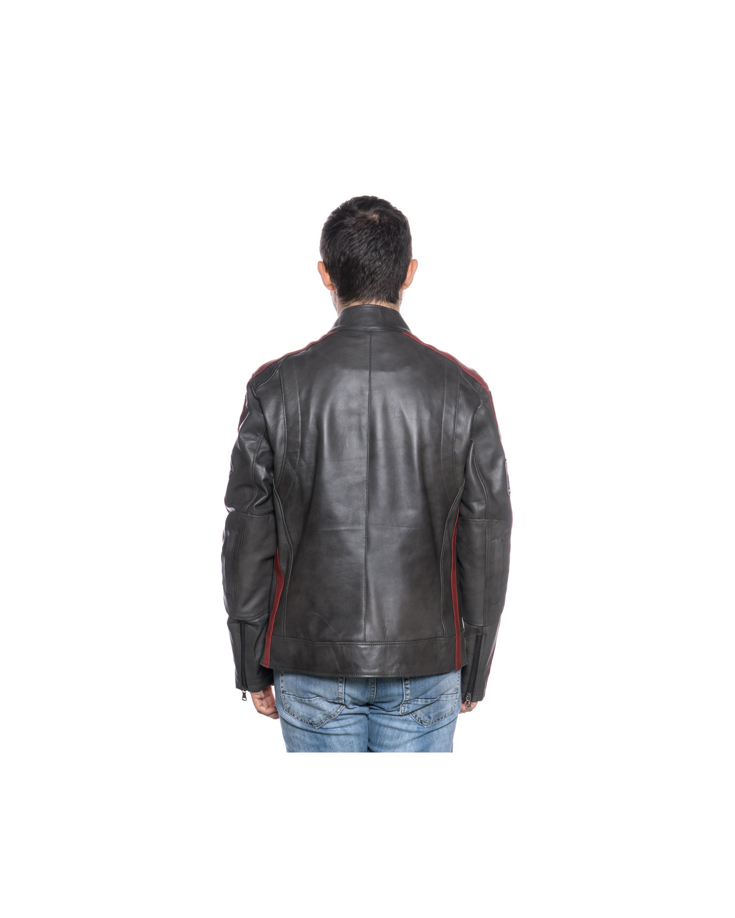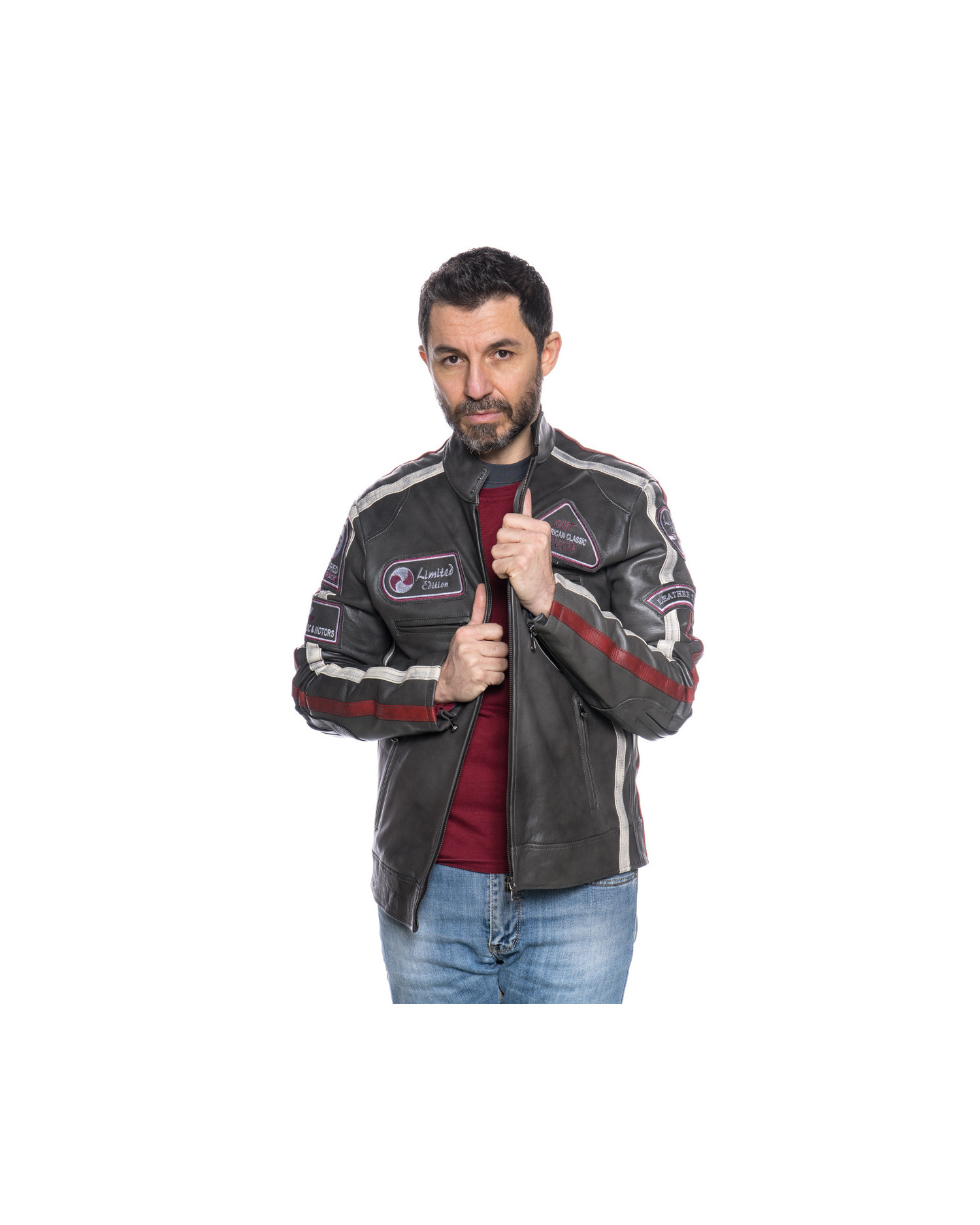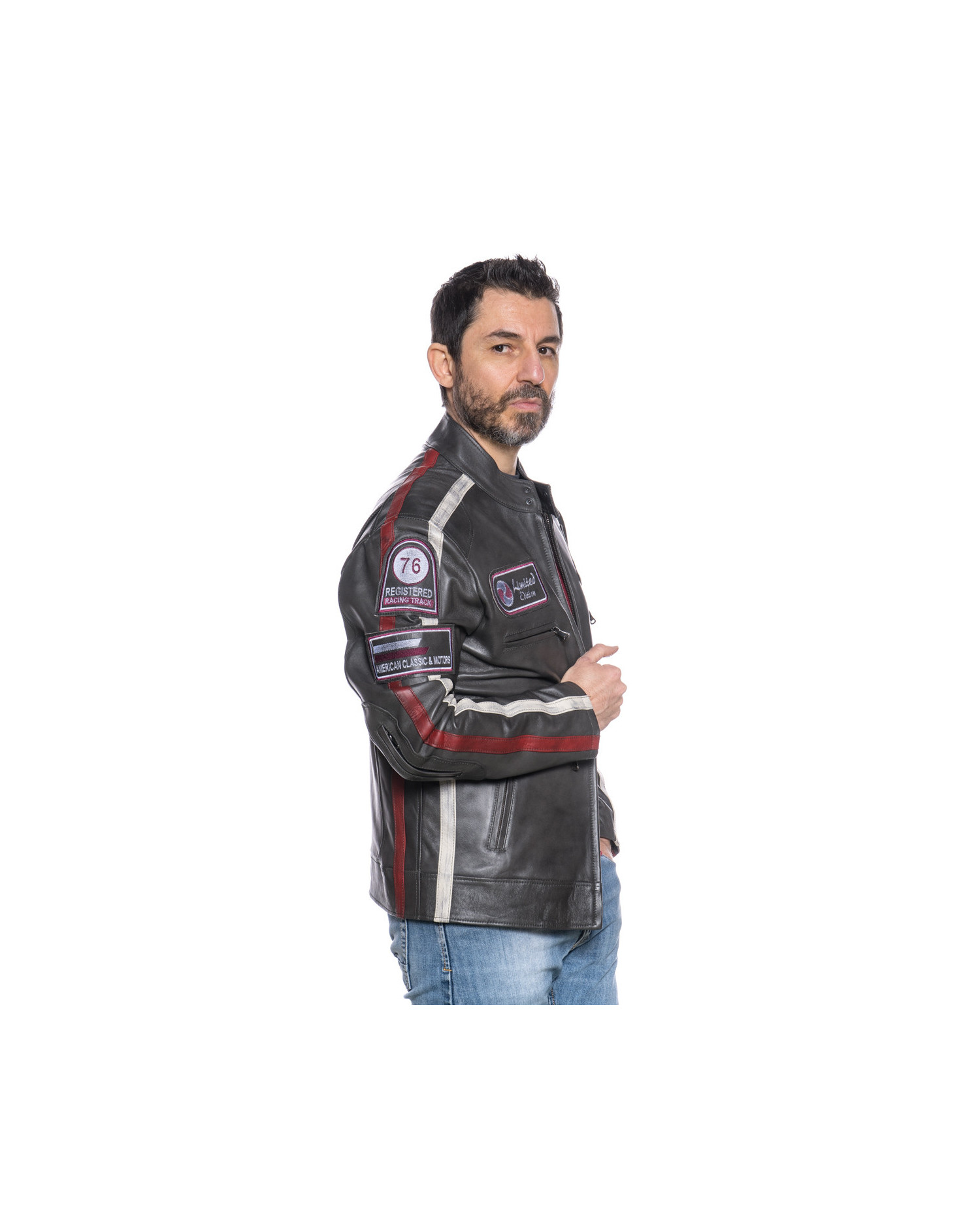 Il biker in pelle Motociclista, impreziosito da patch in rilievo, è la scelta ideale per gli amanti della moto.