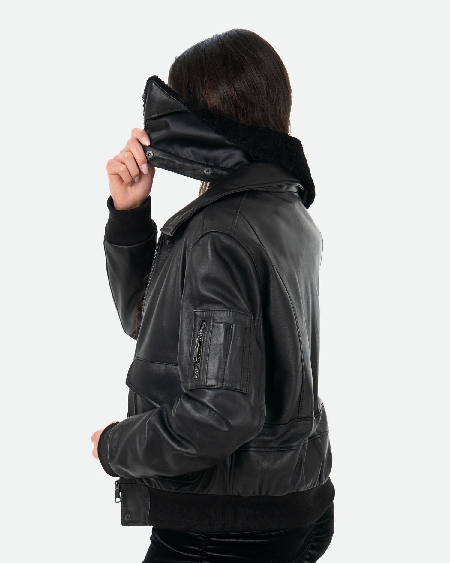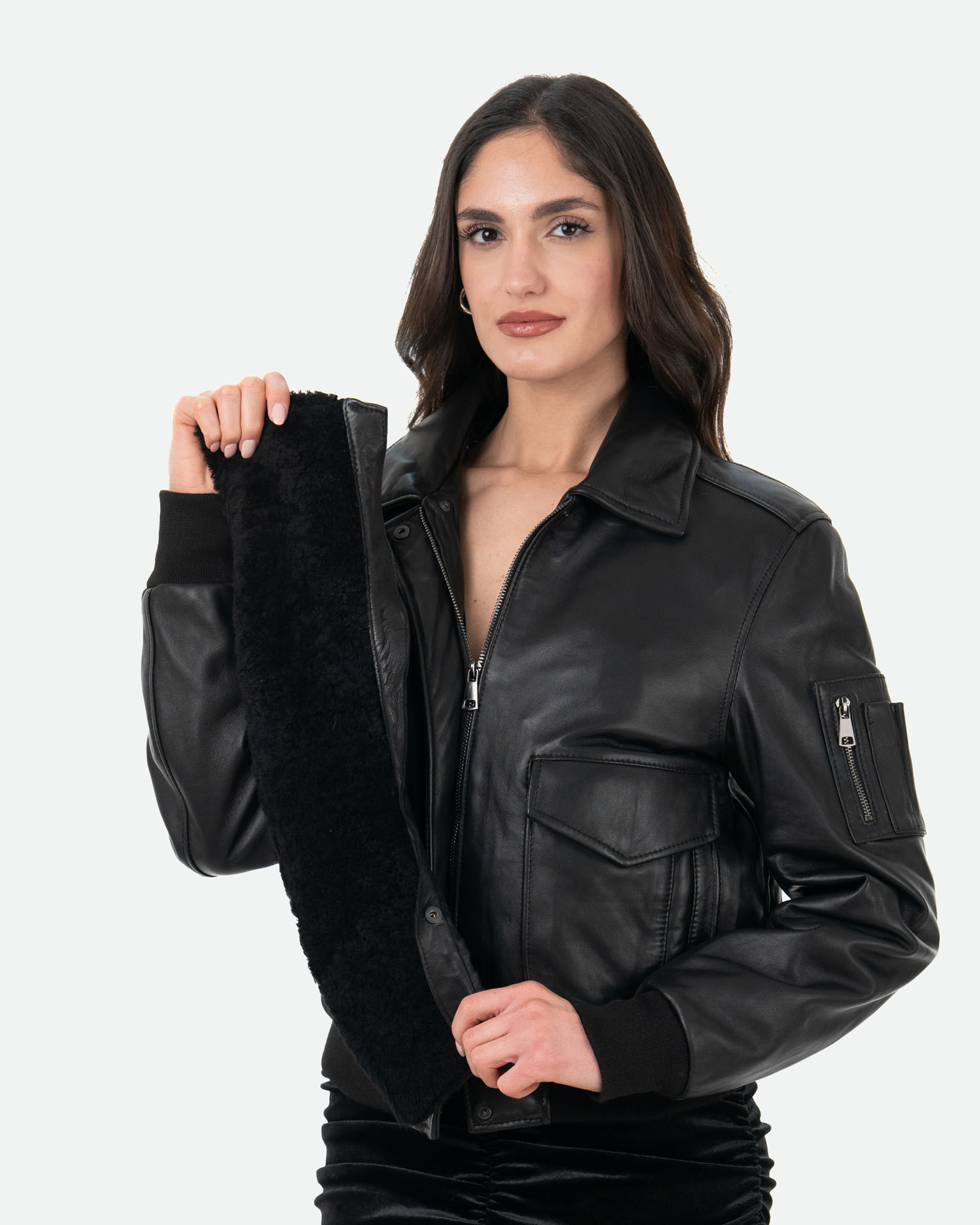 Il bomber in pelle da donna Livia è un capo dallo stile urbano e contemporaneo, pensato per chi cerca eleganza e comfort in un solo capo. Lo stemma da aviatore aggiunge un tocco distintivo e dinamico, mentre il colletto in montone removibile assicura calore e stile.