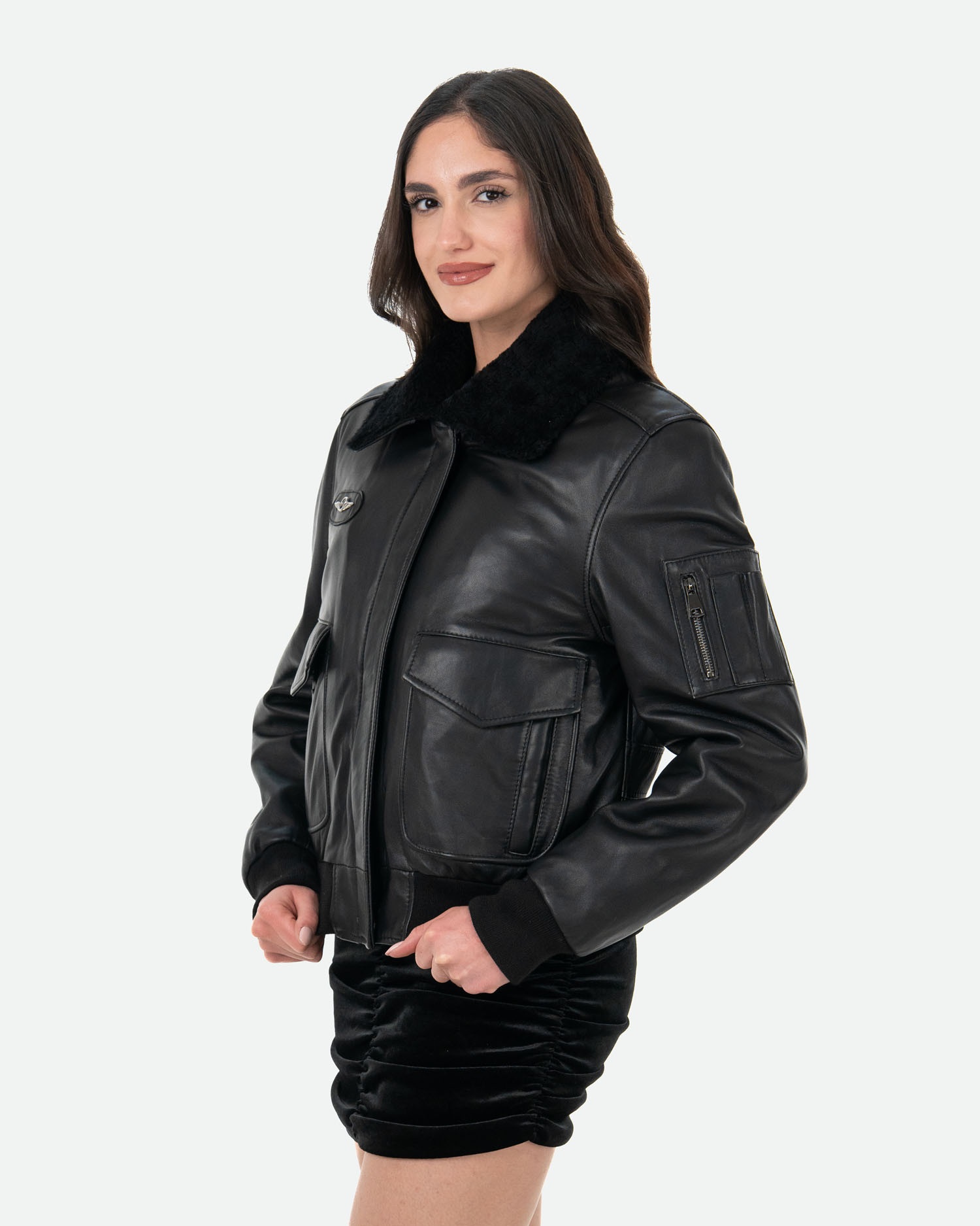 Bomber in pelle stile pilota con colletto in montone e stemma da aviatore sul petto.