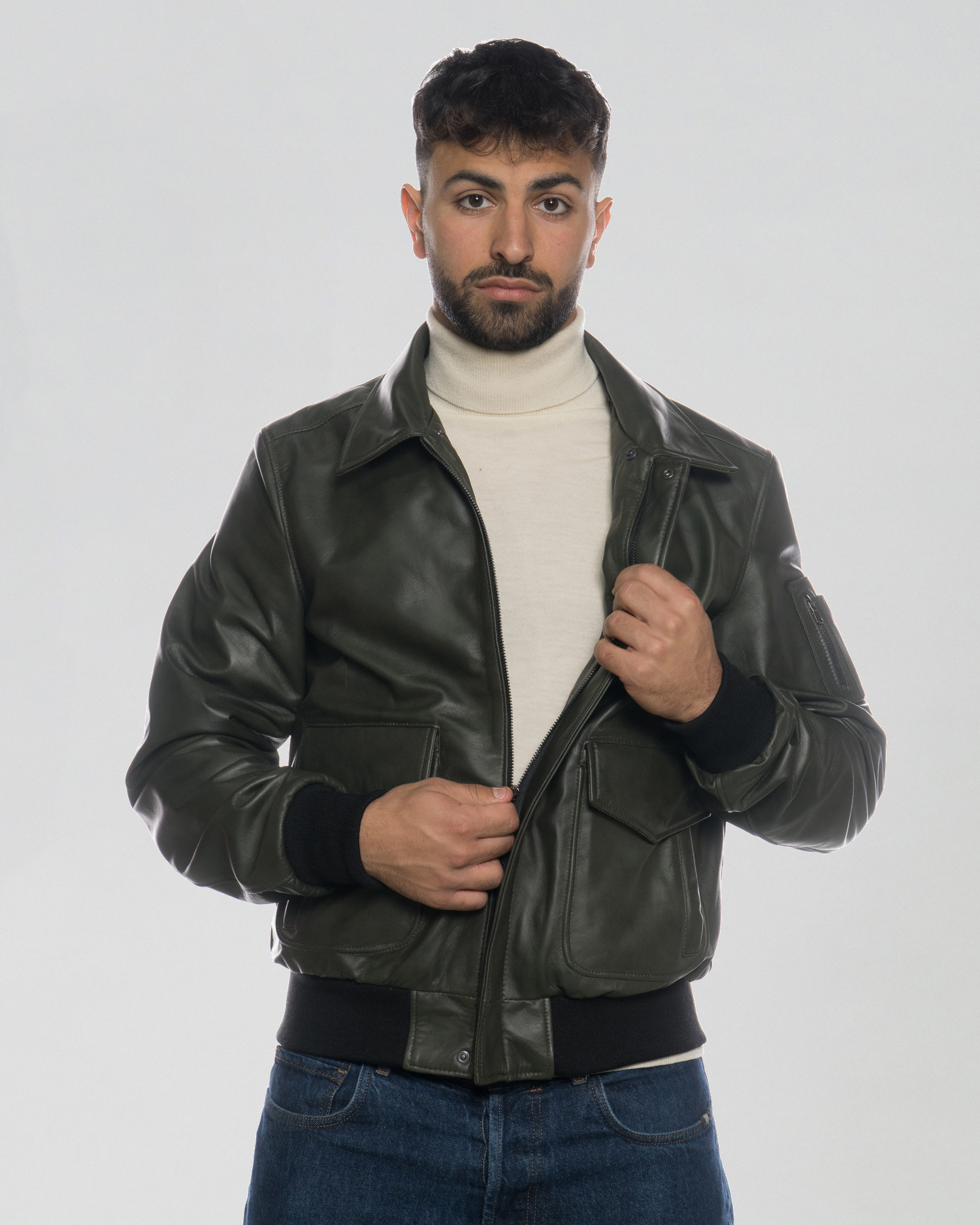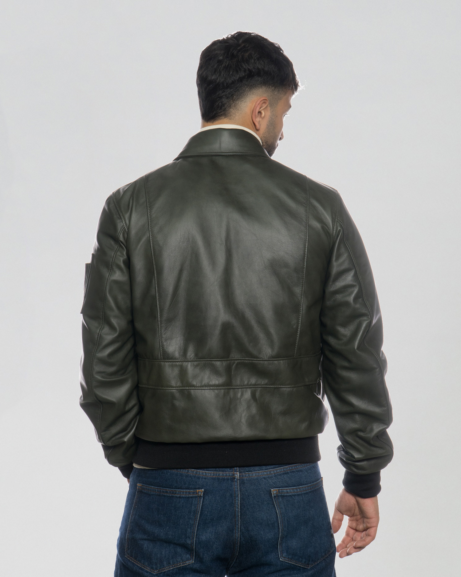 Bomber uomo in vera pelle color verde, con ispirazione aviator e dettagli elasticizzati.