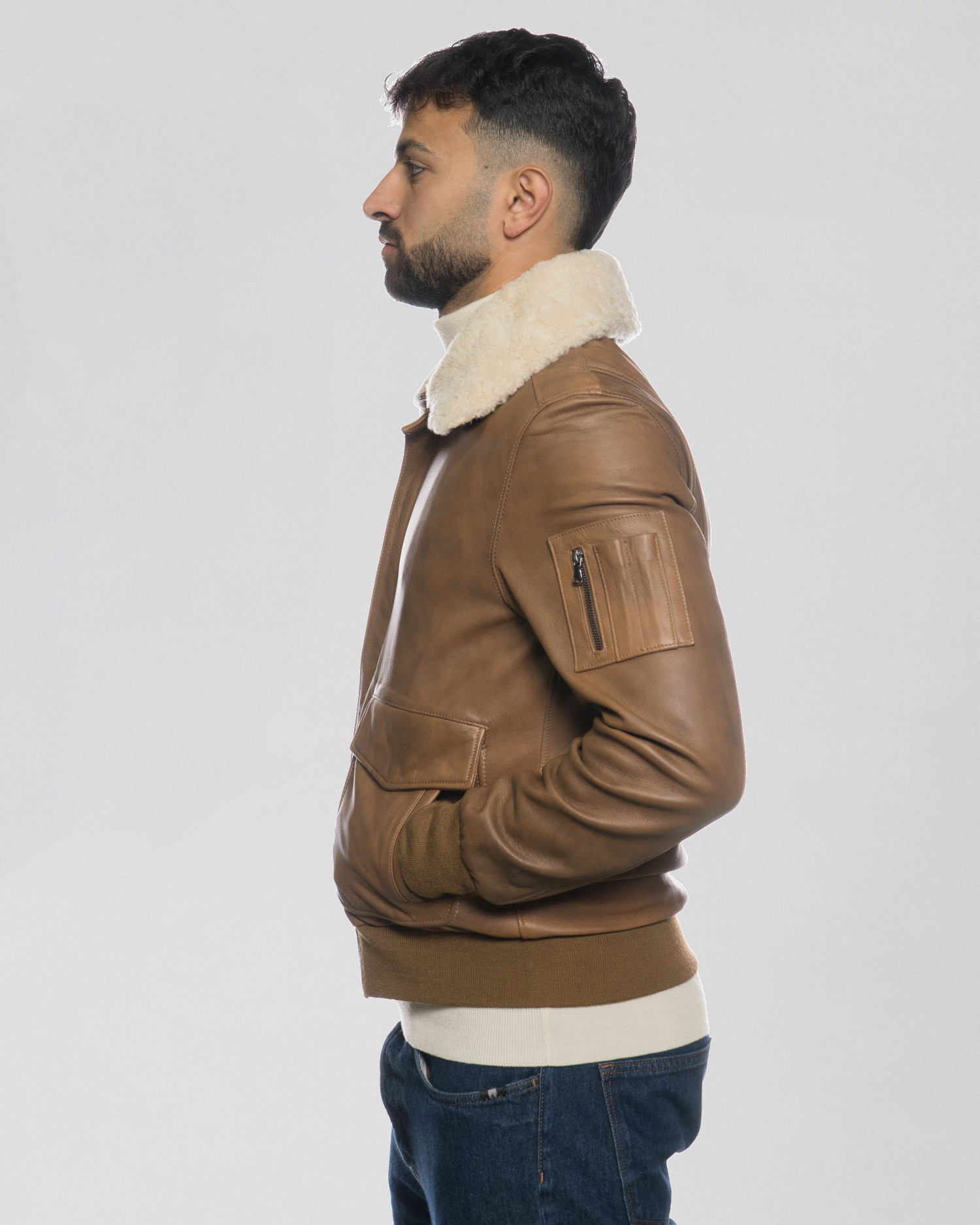 Leo - Bomber Uomo Cuoio in pelle con collo in montone beige