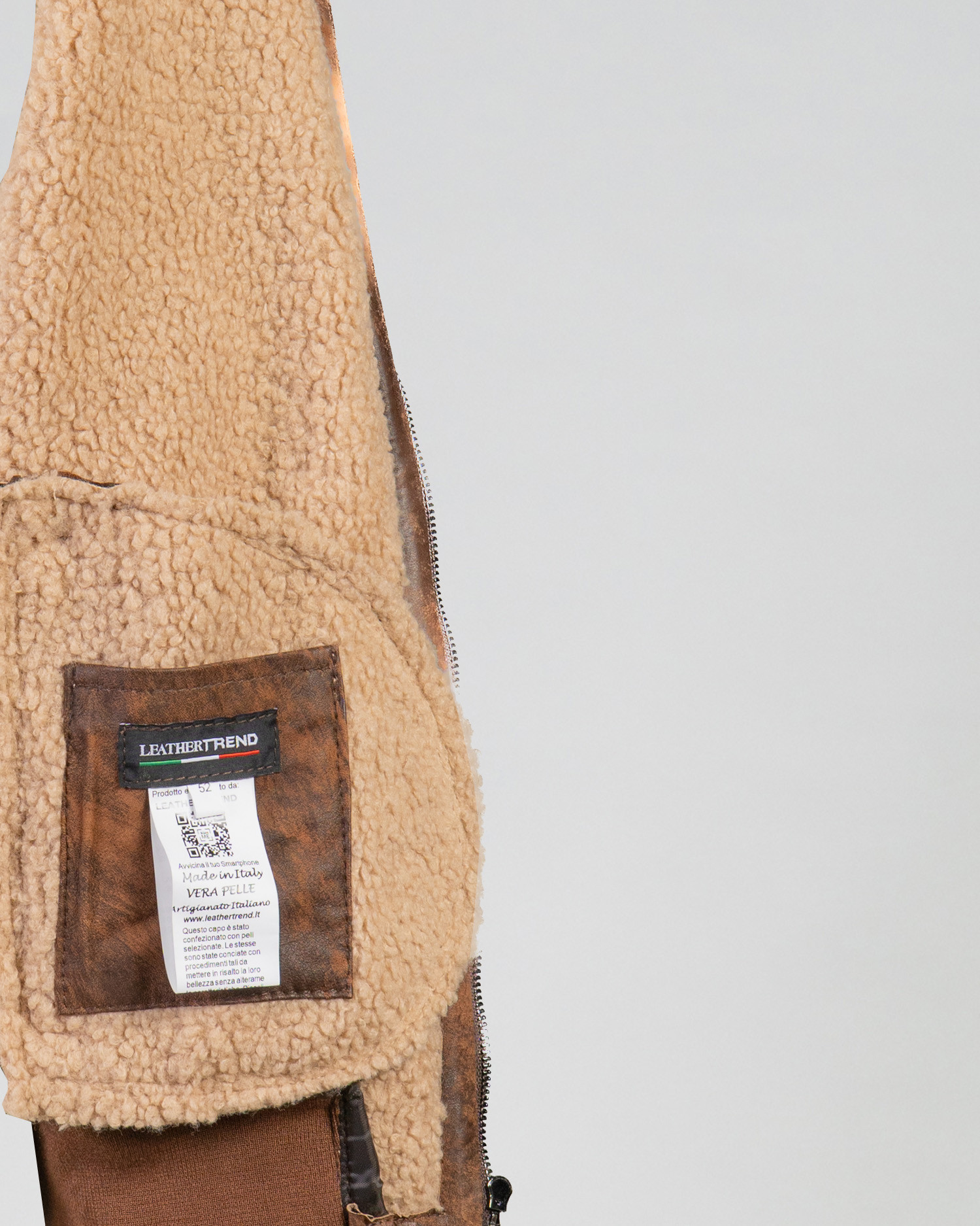 Questo bomber uomo in vera pelle shearling è realizzato artigianalmente con un'attenzione estrema ai dettagli. L'esterno in vera pelle color testa di moro (marrone scuro) presenta una distintiva lavorazione effetto graffiato, che conferisce al capo un look deciso e autentico. L'interno è foderato in morbido poliestere effetto shearling color caramello, garantendo il massimo comfort termico senza rinunciare all'eleganza urbana.