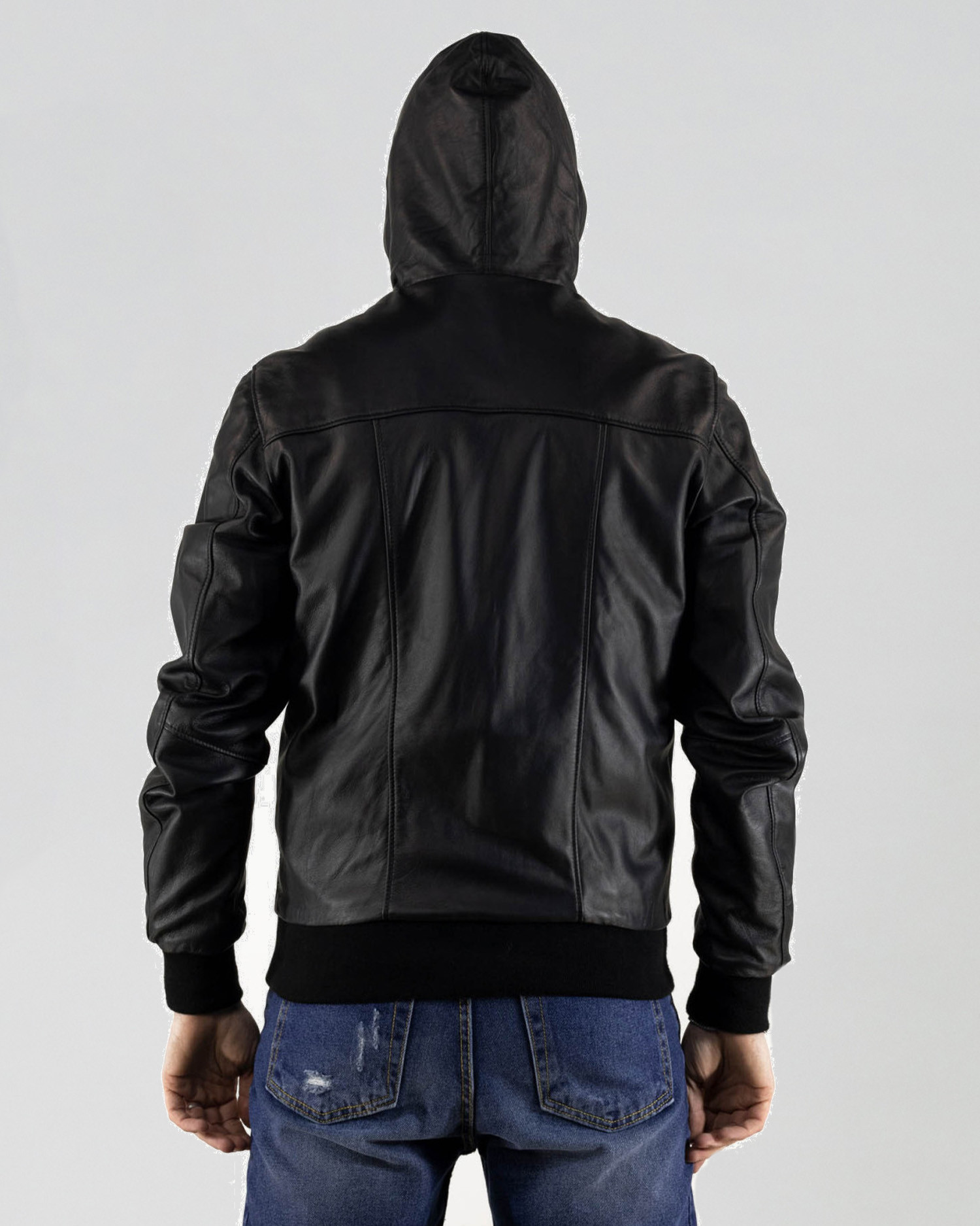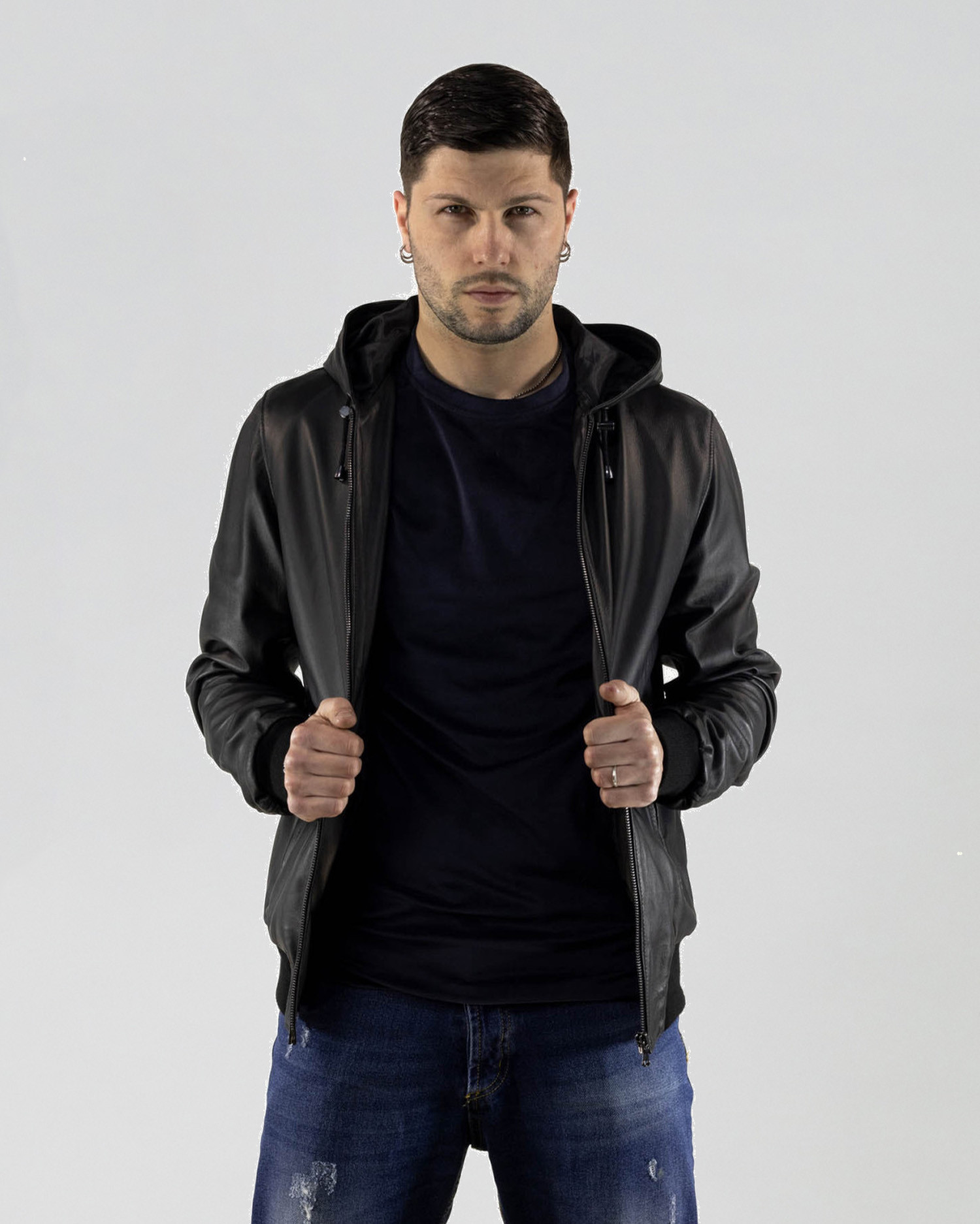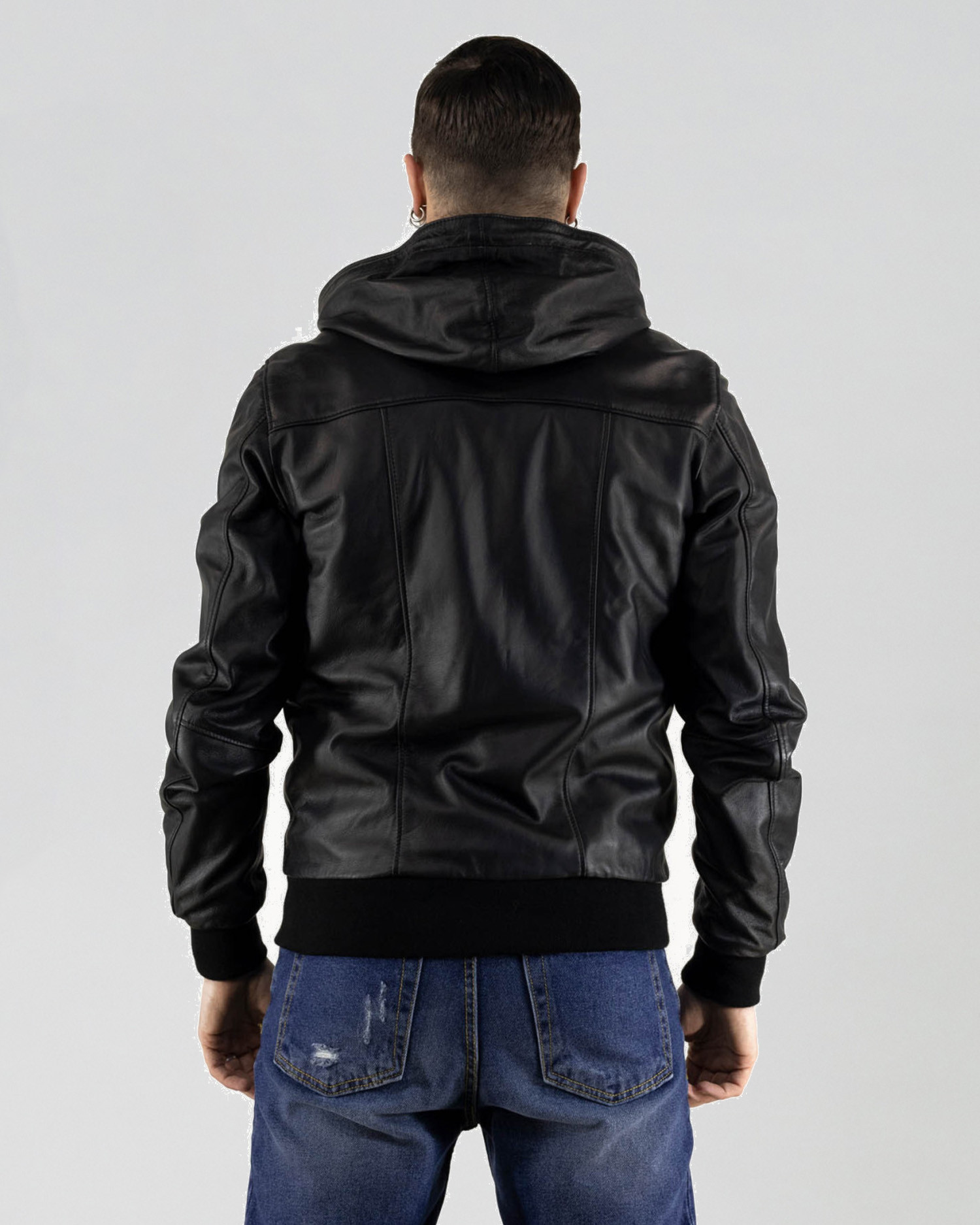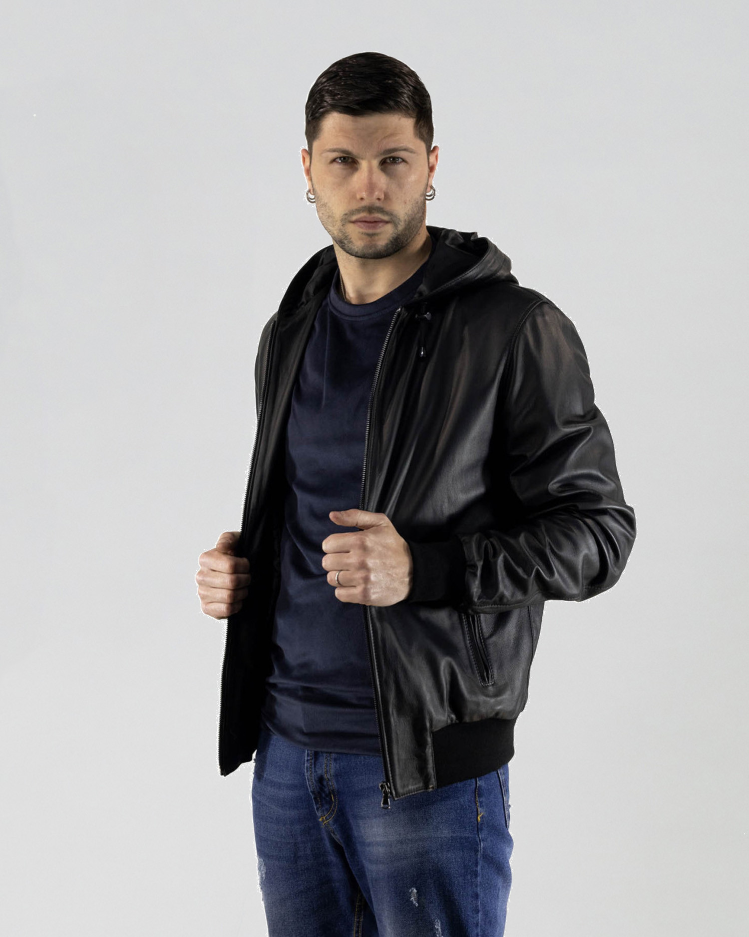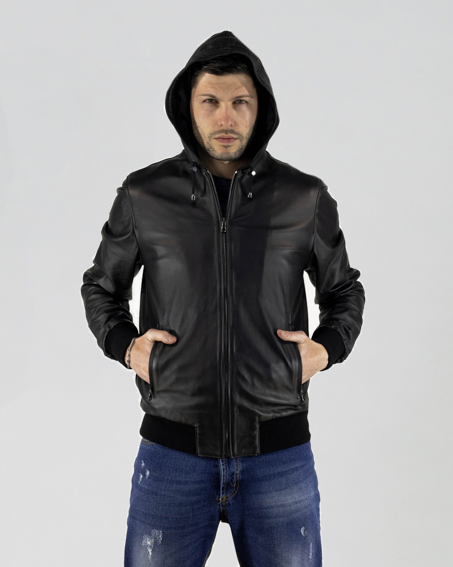 Bomber con cappuccio da uomo in pelle con polsini e fondo elasticizzati.