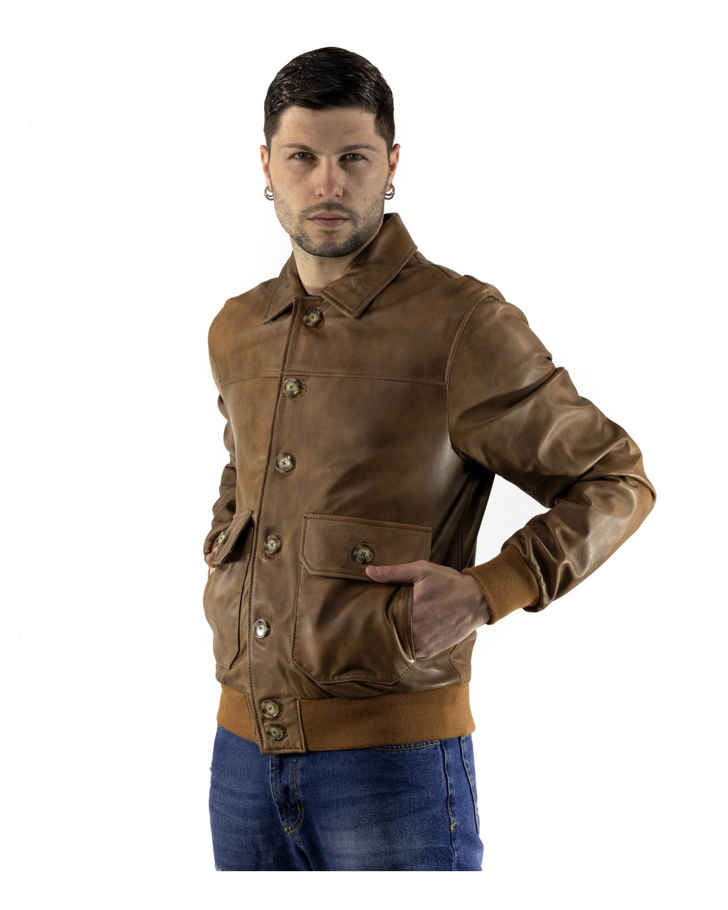 Giacca artigianale in vera pelle, caratterizzata da una struttura morbida al tatto. Il modello presenta un design bomber con collo a camicia. La chiusura frontale è a bottoni, resistenti e facili da aprire. Sono presenti due ampie tasche frontali con patta e bottone, perfette per funzionalità quotidiana e un look strutturato. I polsini e il fondo sono in maglia elasticizzata tono su tono, che garantisce una vestibilità aderente e mantiene il calore. Internamente, la giacca è foderata con tessuto traspirante, pensato per un uso prolungato nelle mezze stagioni. Prodotta in Italia con lavorazione artigianale, ogni pezzo è unico e rifinito con cura nei minimi dettagli.