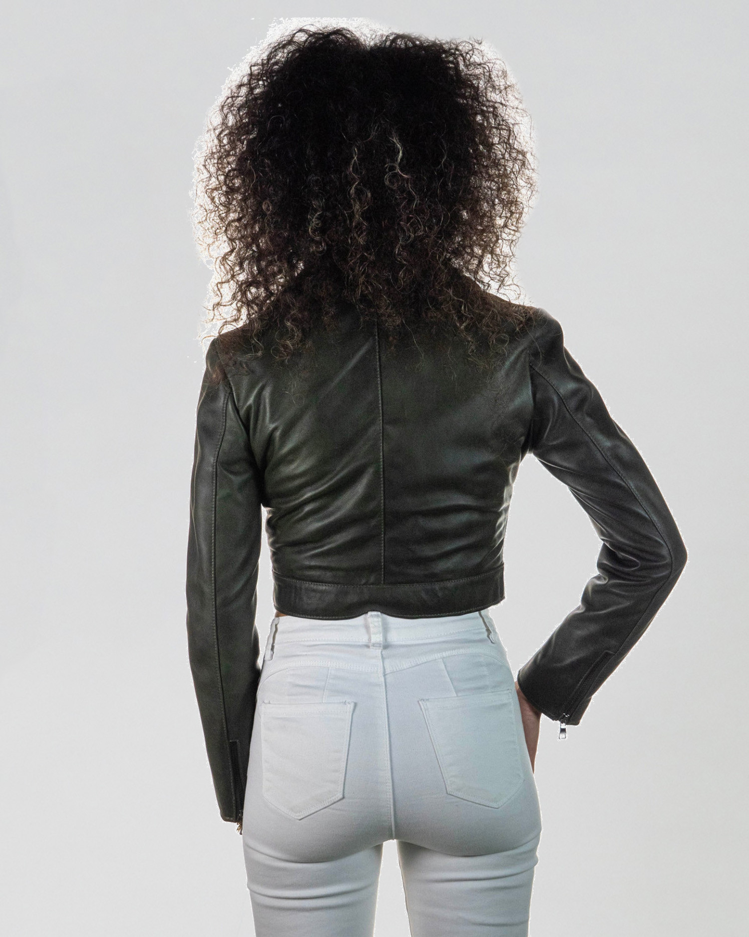 Chiodo in pelle da donna dal taglio corto e cintura regolabile.