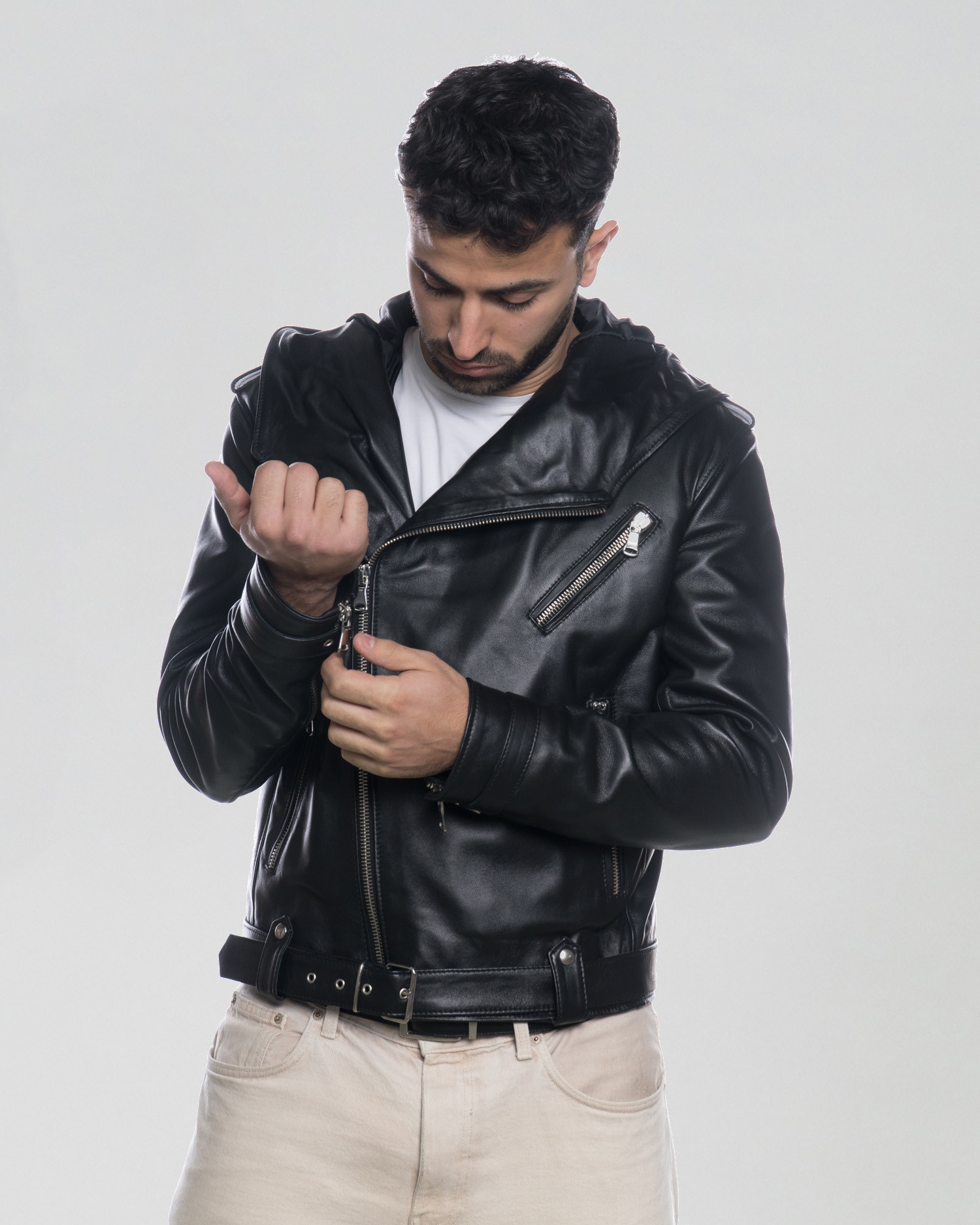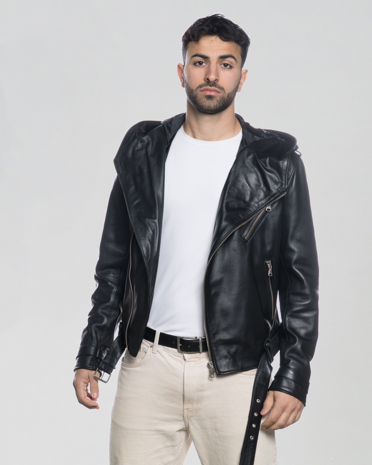 Il Chiodo è caratterizzato da un design moderno e alla moda. È dotata di una cerniera frontale diagonale che si estende dal lato inferiore destro fino al colloe. La giacca presenta due tasche con cerniera sul petto, una sul lato destro e una sul lato sinistro, offrendo spazio per riporre piccoli oggetti in modo sicuro. Inoltre, la giacca è dotata di una cintura con fibbia nella parte inferiore, che permette di regolare la vestibilità per un comfort ottimale. La presenza del cappuccio aggiunge una funzionalità extra, rendendo la giacca adatta anche per le giornate più fredde o piovose.