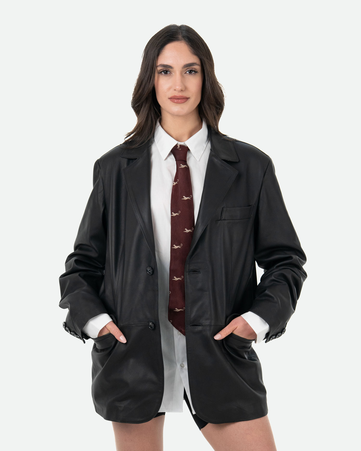 La giacca in pelle Clarissa reinterpreta il classico blazer in chiave moderna, con un taglio oversize pensato per uno stile disinvolto ma sofisticato. Le linee pulite e i revers a lancia donano struttura al capo, rendendolo perfetto per outfit urbani e contemporanei.