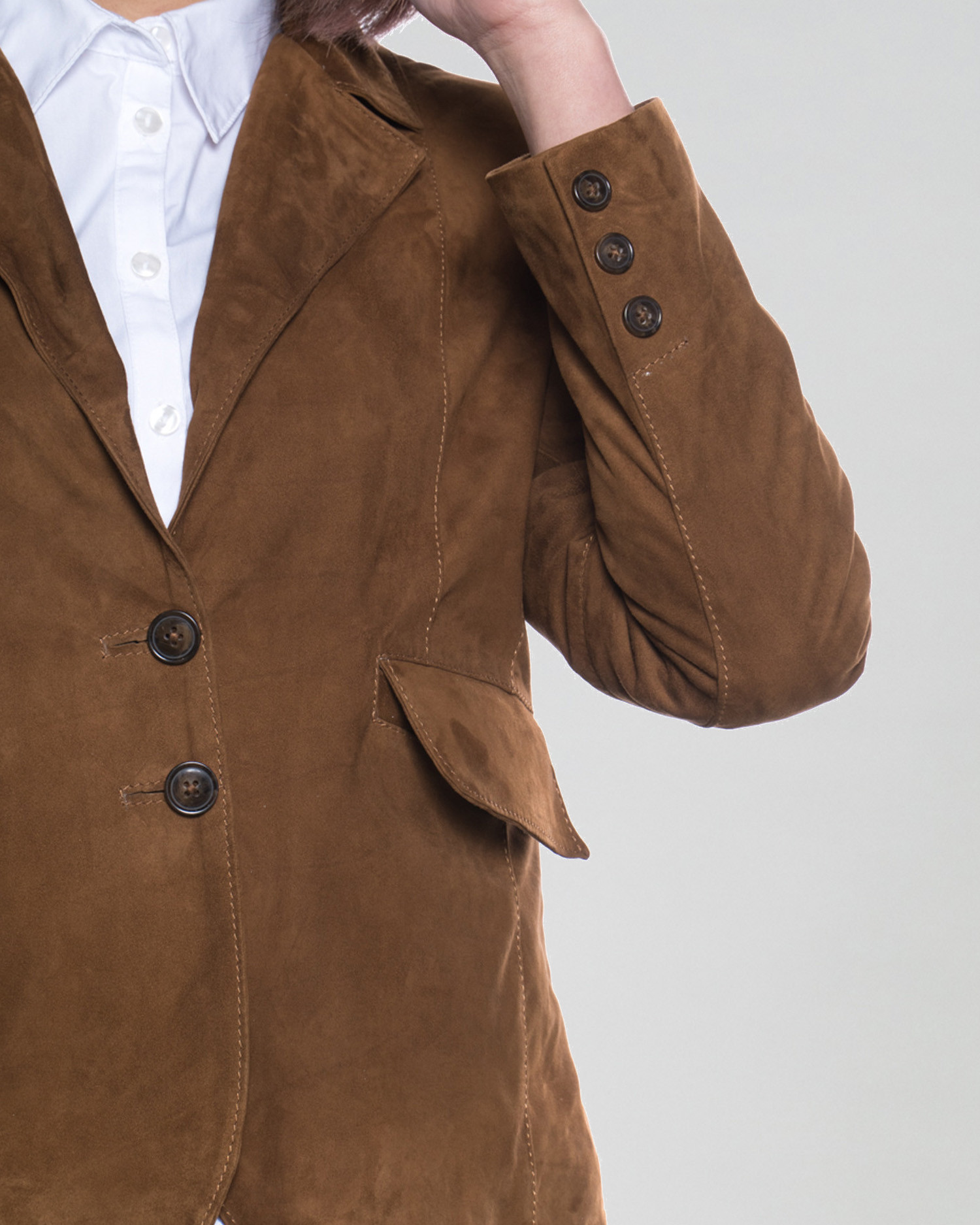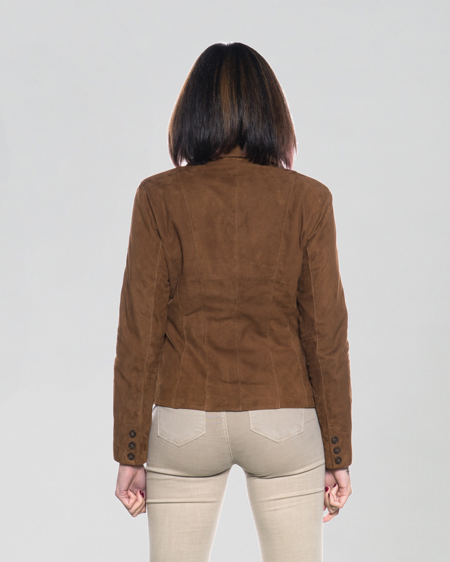 Realizzata in vera pelle scamosciata, morbida al tatto e resistente all’uso quotidiano, questa giacca pelle donna è perfetta per le mezze stagioni. Il colore cuoio, caldo e sofisticato, illumina ogni outfit e si abbina facilmente sia a look formali che a combinazioni più casual.
