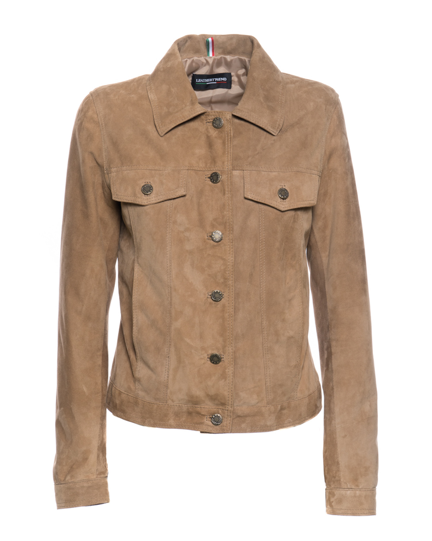 Giacca in pelle scamosciata da donna con chiusura a bottoni e colletto a camicia.