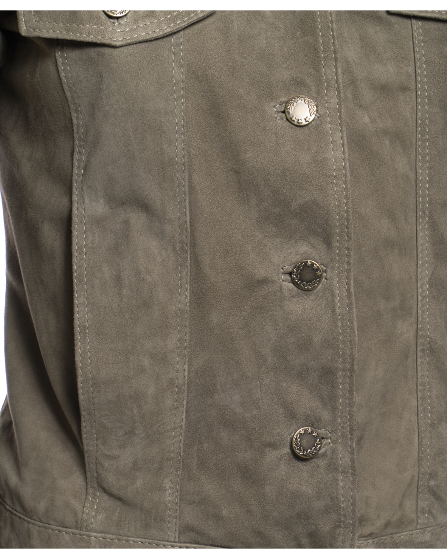 Giacca in pelle scamosciata da donna con chiusura a bottoni e colletto a camicia.