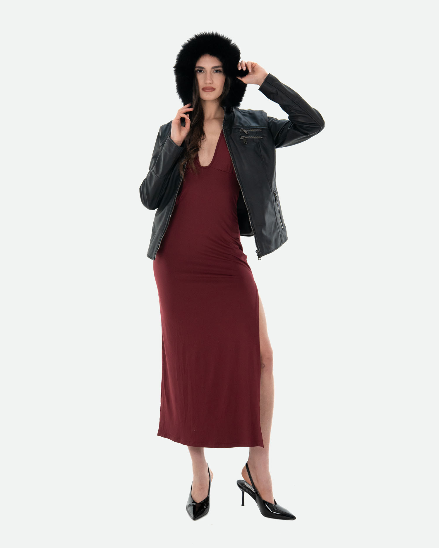 Giacca in pelle con cappuccio in pelliccia murmasky removibile.