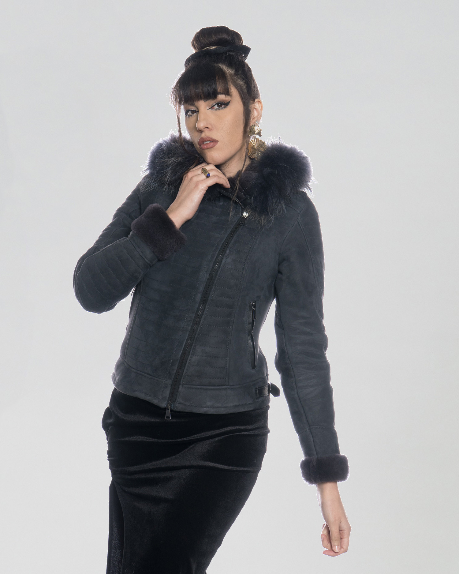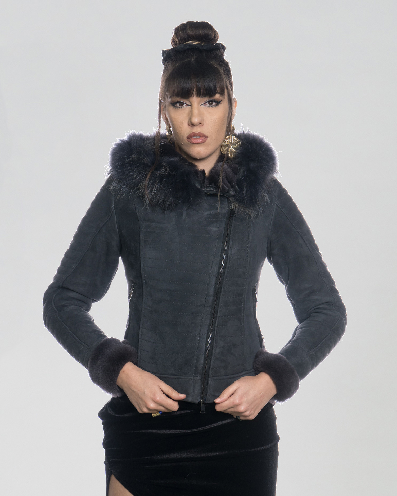 Giacca in vero montone con cappuccio bordato in volpe naturale, dal taglio aderente e zip asimmetrica. Elegante e sofisticata, è perfetta per affrontare l’inverno con stile. I dettagli in pelliccia e la texture vellutata la rendono un capo iconico, ideale per look urbani e ricercati.
