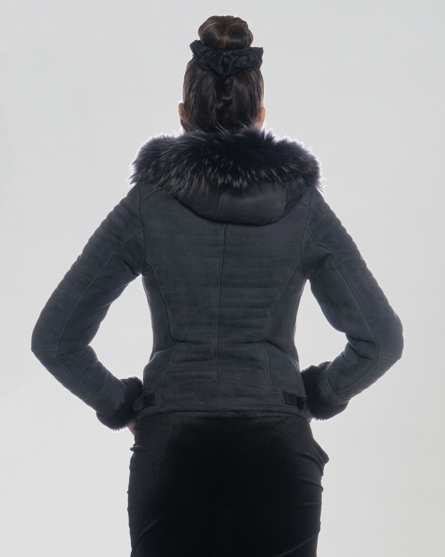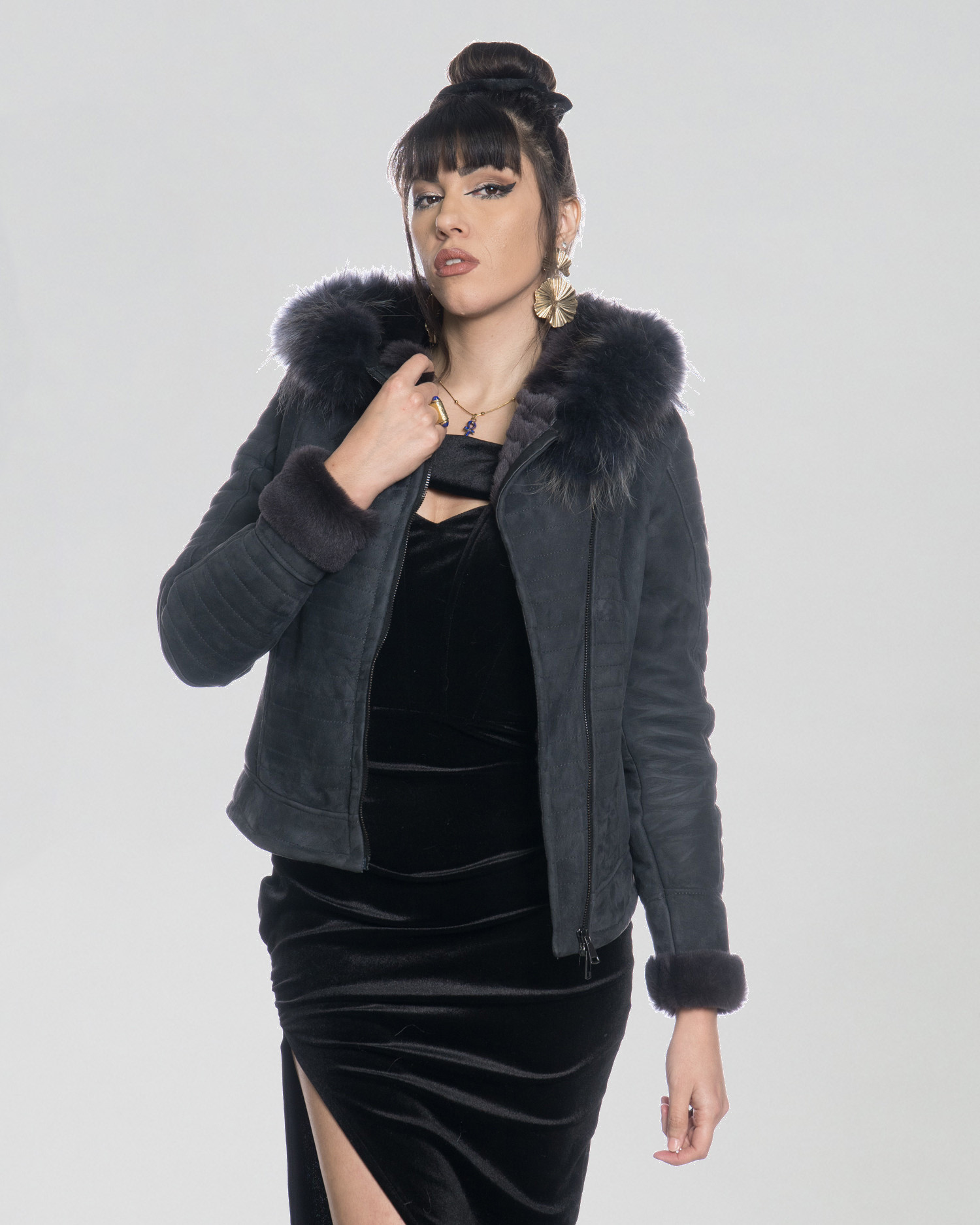 Giacca donna in vero montone con cappuccio in volpe naturale.
