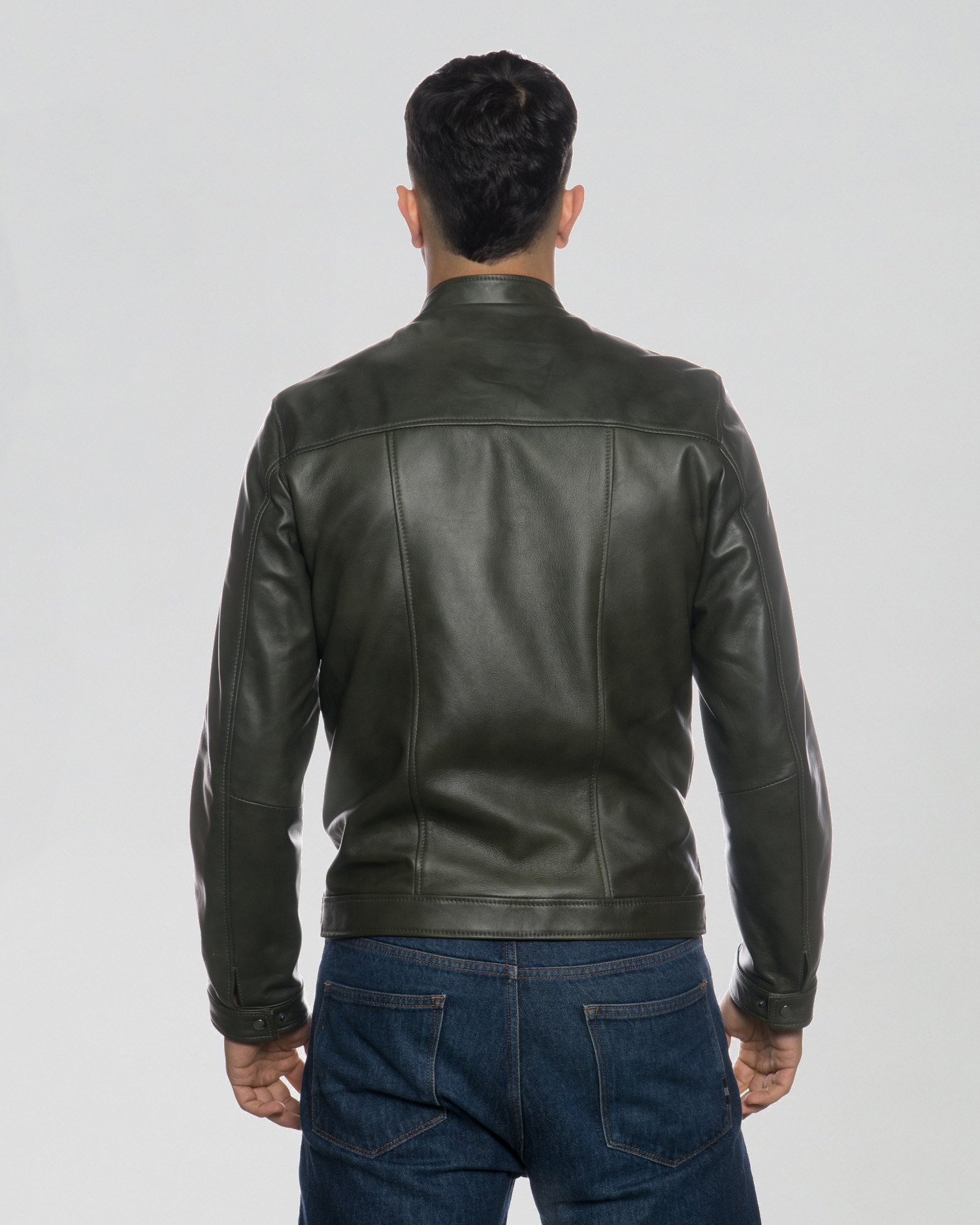 Giacca in pelle con colletto alla coreana.